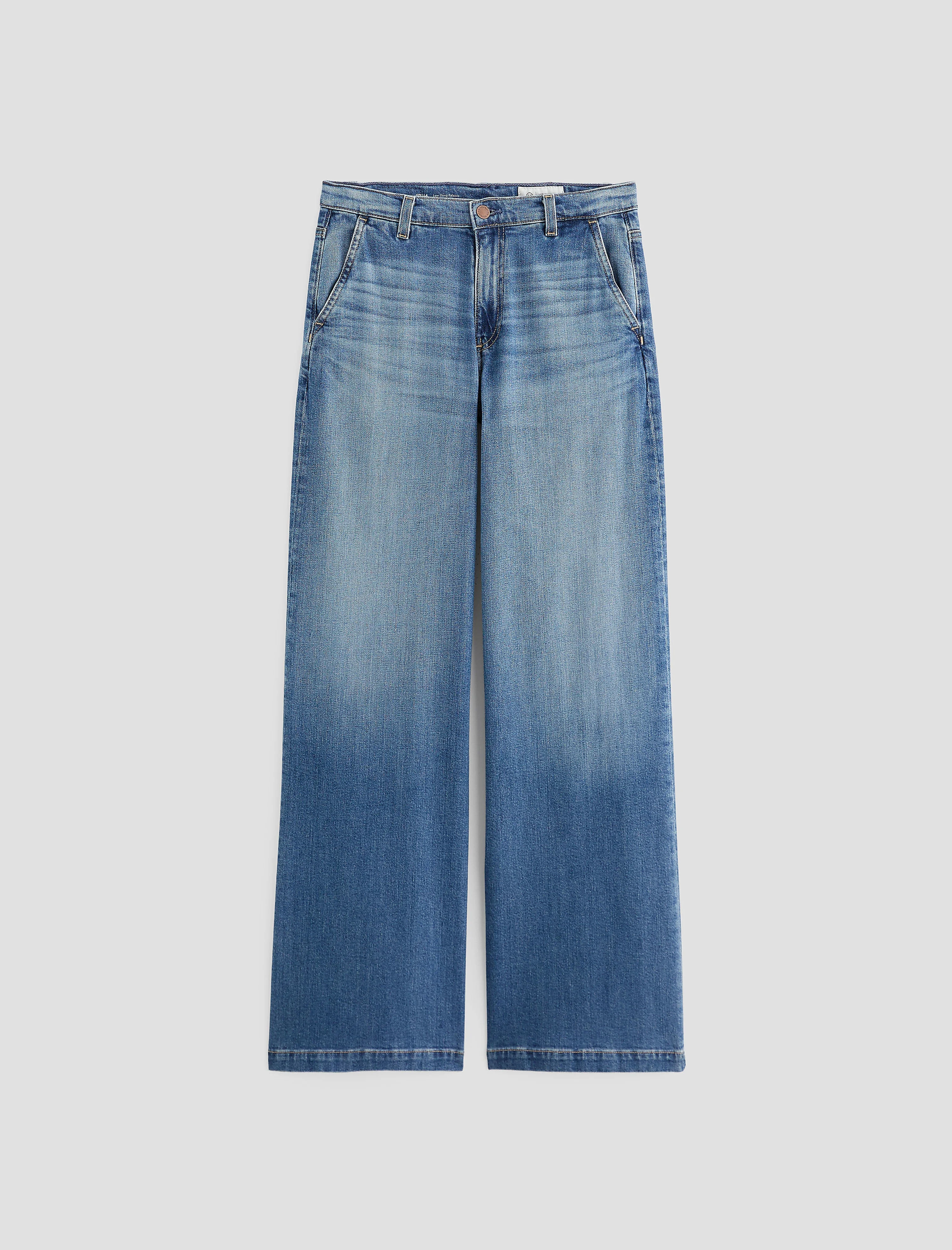 Low Slung Palazzo Stella is a low-slung palazzo pant with a wide-leg silhouette and mid-rise fit. Crafted from comfort-stretch denim for flexibility and ease, it’s AG-ed™ to replicate 16 years of natural wear. The low-slung design enhances its relaxed, laid-back feel, while the fabric offers all-day comfort without sacrificing structure. Crafted from premium denim sourced from Japan’s Kaihara Mill. DETAILS & FIT Model is wearing size 26. - Front Rise: 10 1/2" - Knee Opening: 23 1/4" - Bottom Opening: 25" - Inseam: 32 1/2" FABRIC & CARE Daytripper Stretch Denim, 10 Oz. 72% Cotton, 26% Lyocell, 2% Polyurethane