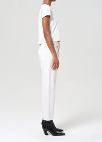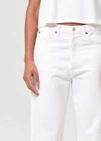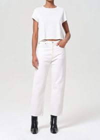 Our best-selling 90's Jean is updated with a cropped inseam, combining vintage-inspired style with a modern twist. The mid-rise fit sits relaxed at the waist, transitioning into a loose, straight leg for a laid-back, effortless silhouette. Made from regenerative cotton in a clean white wash, these jeans offer a timeless, breathable feel with just the right amount of structure. For a chic summer look, pair them with a simple oversized white shirt and slip-on sandals, or style with a lightweight cashmere tank and minimal leather slides for a refined yet relaxed vibe. For the full-length version, shop the 90's Jeans. This fit is intended to be relaxed. Size down for a higher, closer fit. Looks Like: Eggshell warm white clean denim Feels Like: Rigid, non stretch denim made with an authentic, soft hand feel MORE DETAILS Closure: Button Fly Rise: 12 3/4" Inseam: 26" Leg Opening: 16" Model is 5'10" and is wearing a Size 27 Fabric: 100% Organic Cotton Care Instructions: Machine wash cold inside out with like colors. Do not bleach. Tumble dry low. Made in Turkey with imported materials A173C-1183-FRTCO
