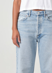 Cue the nostalgia. This 90's-inspired fit, crafted from vintage marbled indigo denim and regenerative cotton, offers a relaxed mid-rise, an eased fit through the hips, and a loose, straight leg. For styling, pair with a simple fitted tank and minimalist sandals for an effortless, casual look, or dress it up with a tucked-in silk blouse and loafers for a polished, refined vibe. This fit is true to size. Looks Like: Vintage marbled light indgo denim with fading and whiskering Feels Like: Rigid, non stretch cotton denim with a soft hand for all day wearability MORE DETAILS Closure: Button Fly Rise: 12 1/2" Inseam: 29" Leg Opening: 16" Model is 5'10" and is wearing a Size 27 Fabric: 100% Regenerative Cotton Care Instructions: Machine wash cold inside out with like colors. Do not bleach. Tumble dry low. Made in TURKEY with imported materials A069J-1206-FORCE