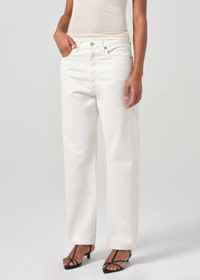 Cue the nostalgia. This 90's-inspired fit, crafted from crisp white denim and regenerative cotton, offers a relaxed mid-rise, an eased fit through the hips, and a loose, straight leg. For styling, pair with a simple beige or white top and neutral sandals for a clean, effortless look. For the shorter inseam, shop the 90's Crop. This fit is intended to be relaxed. Size down for a higher, closer fit. Looks Like: Eggshell warm white clean denim Feels Like: Rigid, non stretch denim made with an authentic, soft hand feel MORE DETAILS Closure: Button Fly Rise: 12 3/4" Inseam: 29" Leg Opening: 16" Model is 5'10" and is wearing a Size 27 Fabric: 100% Organic Cotton Care Instructions: Machine wash cold inside out with like colors. Do not bleach. Tumble dry low. Made in Turkey with imported materials A069I-1183_FRTCO