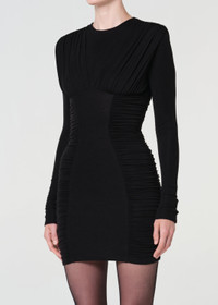 The Abbi Dress is a sleek long sleeve silhouette with subtle ruching for a flattering fit. Cut from ultra-soft lightweight baby rib, it offers gentle stretch and all-day comfort. A versatile essential that pairs effortlessly with boots or layered under jackets. This fit is true to size. Looks Like: Black long sleeve dress with ruching detail Feels Like: Ultra-soft, lightweight fine needle baby rib MORE DETAILS Body Length: 32 1/2" Chest: 26" Shoulder to Shoulder: 13" Sleeve Length: 25 3/4" Model is 5'10" and wearing a size Small Fabric: 94% Lyocell, 6% Spandex Care Instructions: Machine wash cold. Made in USA with imported materials A20009-1618-BLK