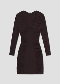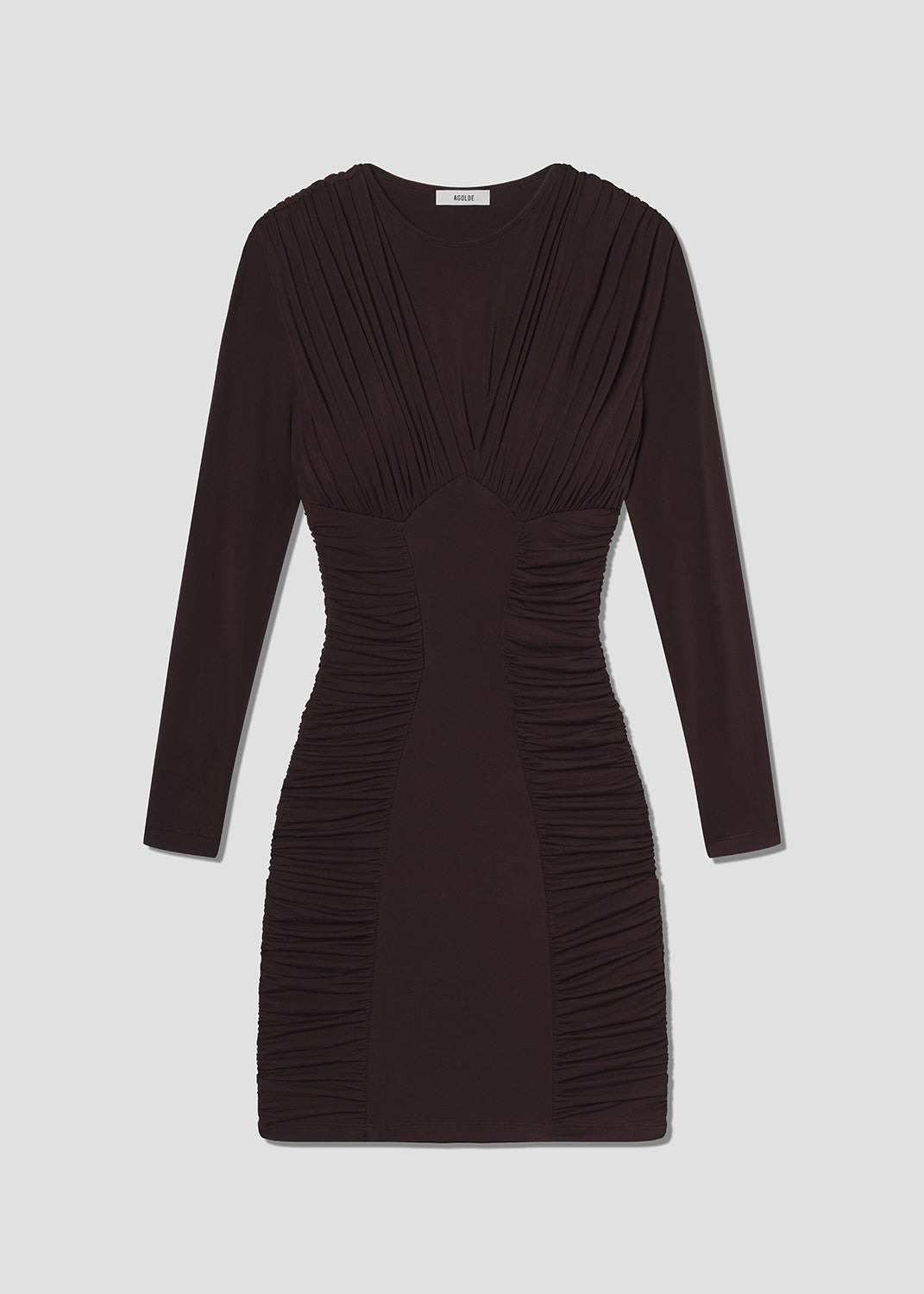 The Abbi Dress is a sleek long sleeve silhouette with subtle ruching for a flattering fit. Cut from ultra-soft lightweight baby rib, it offers gentle stretch and all-day comfort. A versatile essential that pairs effortlessly with boots or layered under jackets. This fit is true to size. Looks Like: Dark brown long sleeve dress with ruching detail Feels Like: Ultra-soft, lightweight fine needle baby rib MORE DETAILS Body Length: 32 1/2" Chest: 26" Shoulder to Shoulder: 13" Sleeve Length: 25 3/4" Model is 5'10" and wearing a size Small Fabric: 94% Lyocell, 6% Spandex Care Instructions: Machine wash cold. Made in USA with imported materials A20009-1618-ROTO
