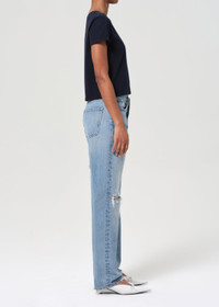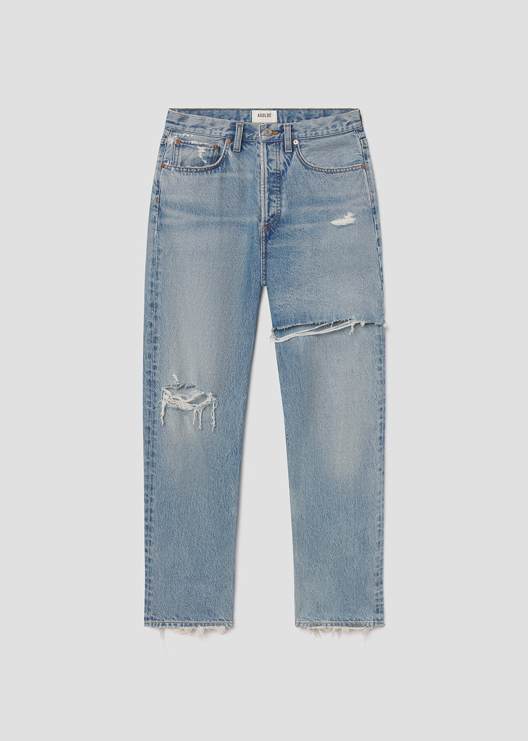 This authentic medium indigo jean features reworked destruction details for a raw, lived-in edge. Crafted from rigid regenerative cotton with a soft hand, the high-rise straight fit offers all-day comfort and a true-to-size silhouette. Style with a relaxed tee for an effortlessly cool look. This fit is true to size. Looks Like: Authentic medium indigo denim pant with reworked destruction detail Feels Like: Rigid, non stretch cotton denim with a soft hand for all day wearability MORE DETAILS Closure: Button Fly Rise: 11 3/4" Inseam: 32" Leg Opening: 24" Model is 5'10" and is wearing a Size 27 Fabric: 100% Regenerative Cotton Care Instructions: Machine wash cold inside out with like colors. Do not bleach. Tumble dry low. Made in USA with imported materials A272-1206-RLSN
