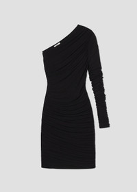 The Annette Dress features an asymmetrical one sleeve silhouette with subtle ruching for a flattering fit. Cut from ultra-soft lightweight baby rib, it offers gentle stretch and all-day comfort. Perfect for dressing up or layering for a modern look. This fit is true to size. Looks Like: True black asymmetrical one sleeve dress with ruching detail Feels Like: Ultra-soft, lightweight fine needle baby rib MORE DETAILS Body Length: 34" Chest: 28 1/2" Hip: 27" Sleeve Length: 26" Model is 5'10" and wearing a size Small Fabric: 94% Lyocell, 6% Spandex Care Instructions: Machine wash cold. Made in USA with imported materials A20007-1618-BLK