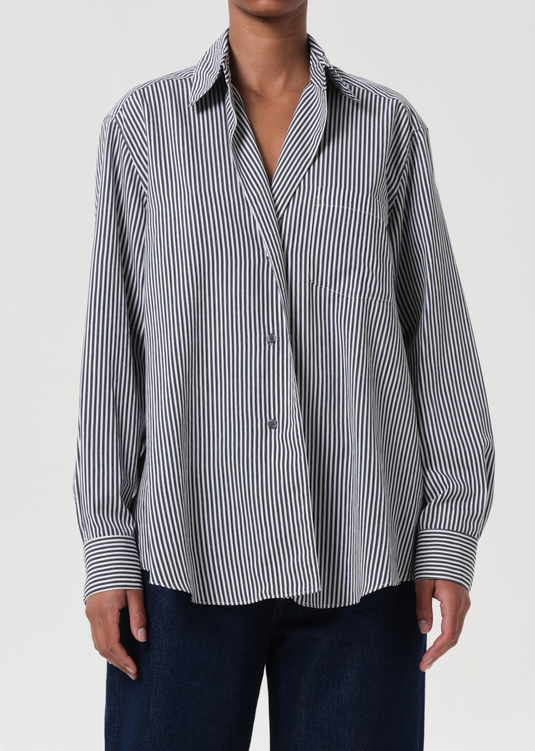 The Aris Shirt is cut in a relaxed silhouette with a classic collar and subtle dropped shoulder. Crafted with an ultra-lightweight feel, it drapes effortlessly with a refined, menswear-inspired black-and-white stripe. Style loosely over denim or half-tucked into tailored trousers for an easy, pulled-together look. This fit is true to size. Looks Like: Black and white mini stripe long sleeve poplin shirt Feels Like: Ultra lightweight yet durable viscose blend MORE DETAILS Body Length: 29 1/2" Shoulder to Shoulder: 17 1/2" Chest: 50" Sweep: 52" Sleeve Length: 23 1/2" Model is 5'10" and wearing a size Small Fabric: 88% Viscose, 12% Polyamide Care Instructions: Machine wash cold inside out with like colors. Do not bleach. Tumble dry low. Made in Turkey with imported materials A7380-1790-SLNST