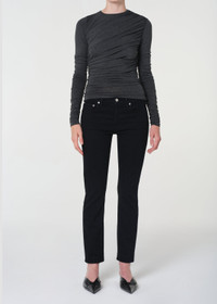 The Cocktail Ankle Jean is a slim, ankle-length pant in clean, saturated black denim. Crafted from comfort-stretch regenerative cotton with a super-soft hand, it offers a sleek, true-to-size silhouette for all-day wear. Perfect paired with fitted tops or layered under oversized knits for a modern, versatile look. This fit is true to size. Looks Like: Clean saturated black denim pant Feels Like: Comfort stretch, archive denim with a super soft hand for all day wearability MORE DETAILS Closure: Button Fly Rise: 9 3/4" Inseam: 28 1/2" Leg Opening: 13" Model is 5'10" and is wearing a Size 27 Fabric: 99% Regenerative Cotton, 1% Elastane Care Instructions: Machine wash cold inside out with like colors. Do not bleach. Tumble dry low. Made in Turkey with imported materials A291-1854-IMMR