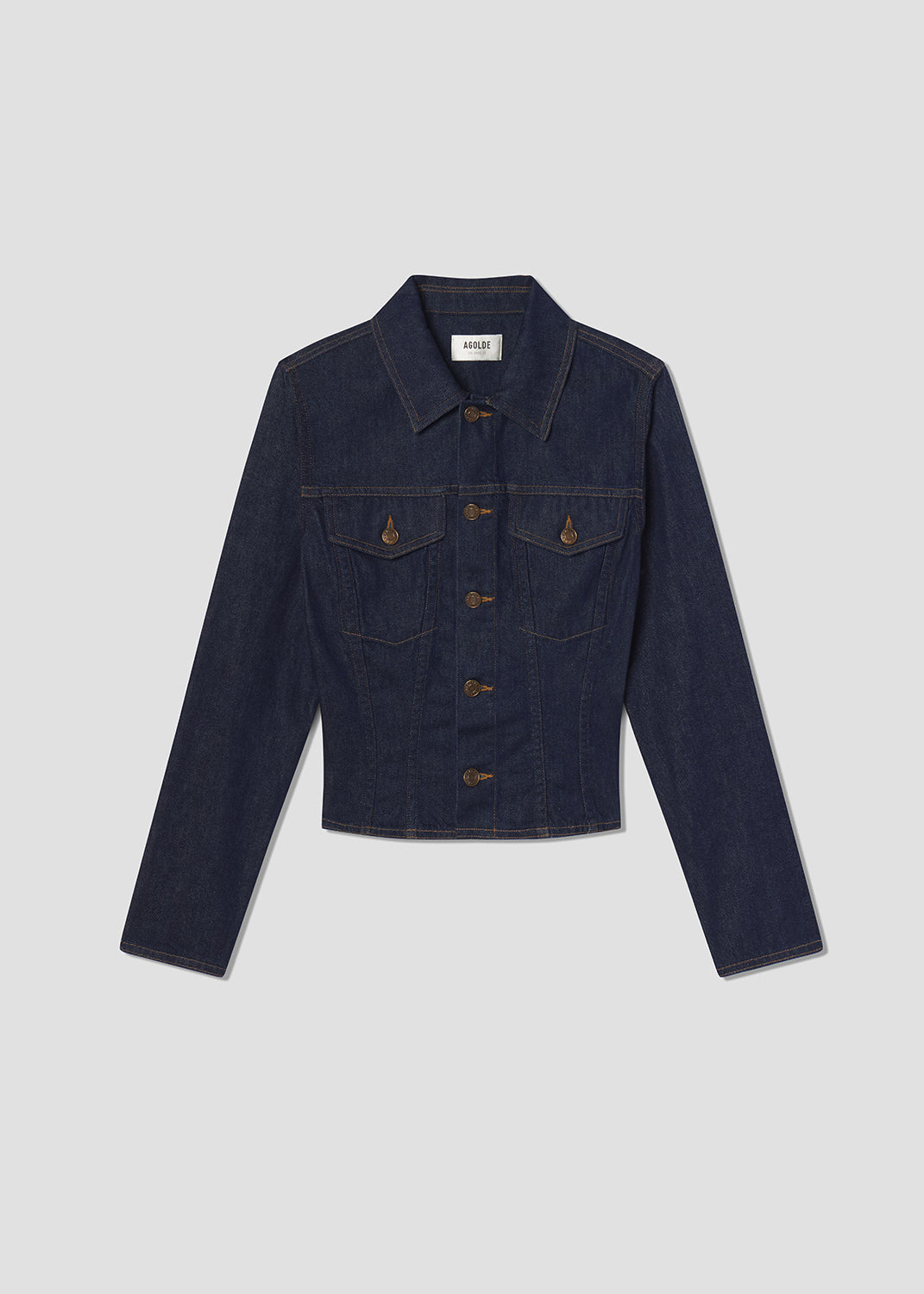 The Contoured Jacket features a flattering, fitted silhouette with clean lines and shaping seams through the body. Crafted from non-stretch, weightless regenerative cotton denim, this deep indigo rinse delivers a polished, minimal look. Wear it with tonal denim or layered over a crisp tee for easy structure. This fit is true to size. Looks Like: Dark deep rinsed indigo fitted denim jacket Feels Like: Non stretch, weightless denim washed down for a super soft feel MORE DETAILS Body Length: 20 1/2" Shoulder to Shoulder: 16 1/4" Chest: 36" Sweep: 31 1/2" Sleeve Length: 22 1/4" Model is 5'10" and wearing a size Small Fabric: 80% Regenerative Cotton, 20% Post Consumer Recycled Cotton Care Instructions: Machine wash cold inside out with like colors. Do not bleach. Tumble dry low. Made in Turkey with imported materials A5108-1812-NSE