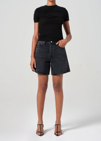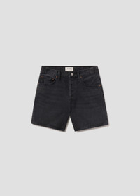 The Dame Short is crafted from washed black denim with subtle whiskering, giving it a worn-in, vintage feel. Featuring a high-rise fit, relaxed silhouette, and wide leg opening, these shorts offer a perfect balance of comfort and style. The clean hem adds a polished touch, making them ideal for pairing with a simple tank or oversized shirt for an effortlessly cool, warm-weather look. This fit is true to size. Looks Like: Washed black denim short with whiskering and clean hem Feels Like: Rigid, non stretch cotton denim with a soft hand for all day wearability MORE DETAILS Closure: Button Fly Rise: 12" Inseam: 6" Leg Opening: 25 1/2" Model is 5'10" and is wearing a Size 27 Fabric: 100% Regenerative Cotton Care Instructions: Machine wash cold inside out with like colors. Do not bleach. Tumble dry low. Made in Turkey with imported materials A221-1157-HICH