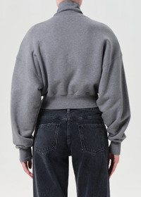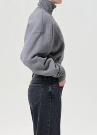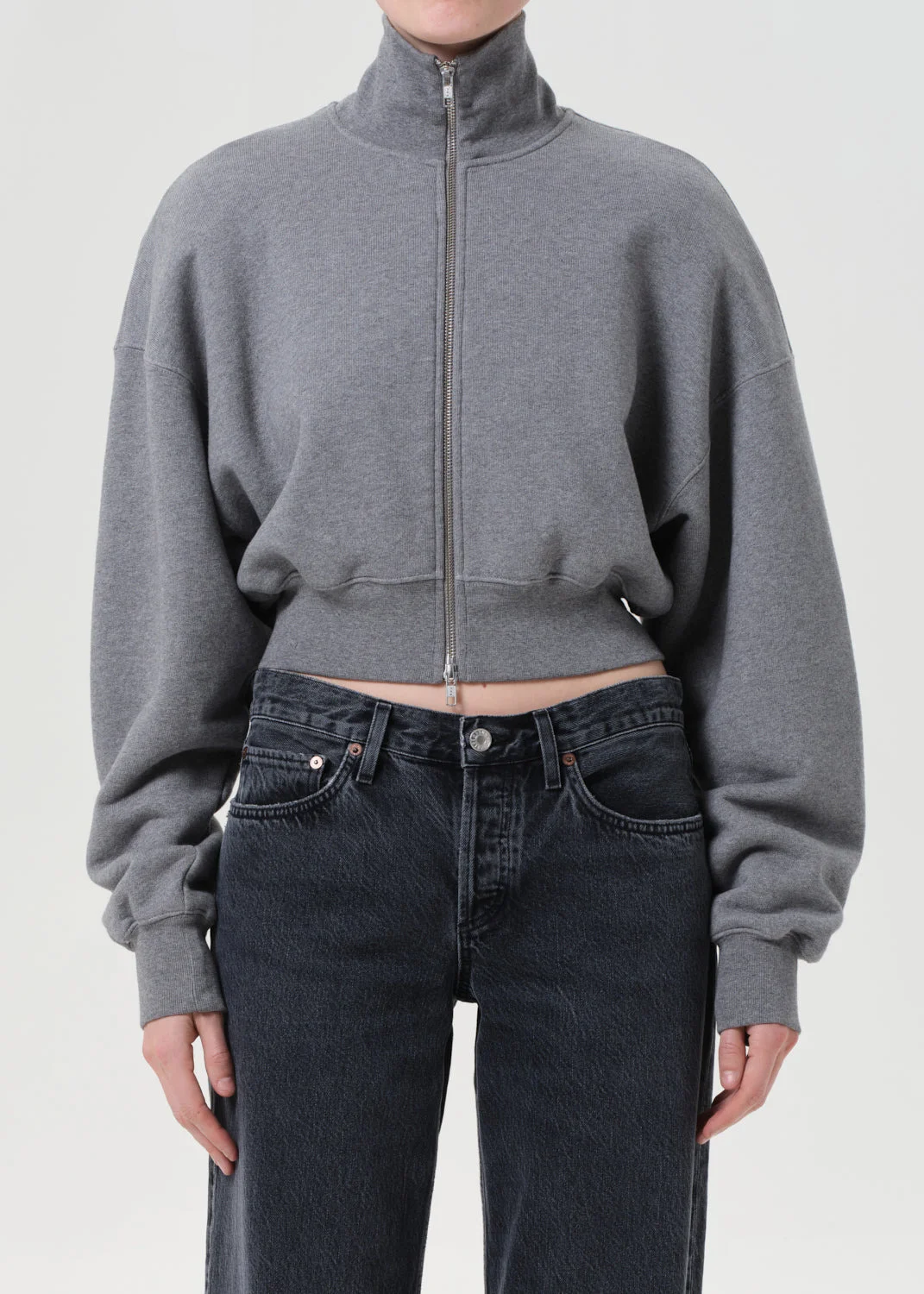 The Darby Zip Up is a high-collared sweatshirt with a cropped, boxy fit and exaggerated ribbed hem. Made from breathable, soft cotton fleece with a natural drape, it’s offered in a medium grey for an easy, go-with-everything tone. Pair with relaxed denim or layered sweats for a modern, off-duty uniform. This fit is true to size. Looks Like: Medium grey high collared zip front sweatshirt Feels Like: Breathable soft cotton fleece with just the right amount of drape MORE DETAILS Body Length: 19" Shoulder to Shoulder: 25 1/4" Sleeve Length: 21 1/2" Model is 5'10" and wearing a size Small Fabric: 100% Cotton Care Instructions: Machine wash cold. Made in Portugal with imported materials A7396-GRYHR