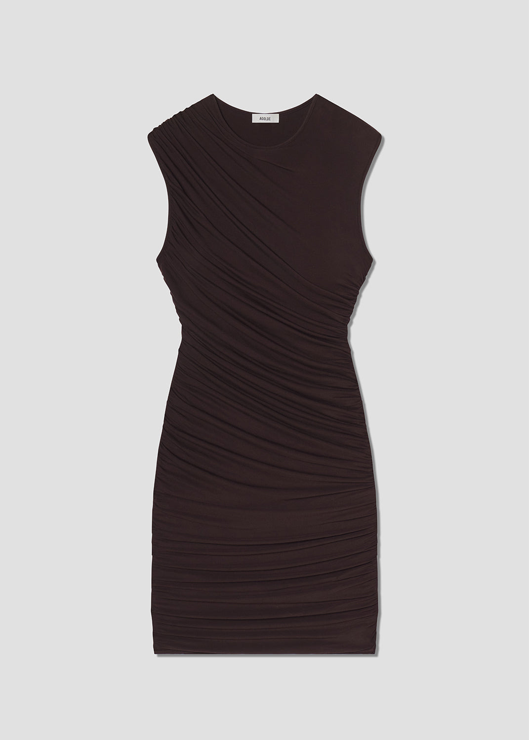 The Ester Twist Dress is a sleeveless silhouette with subtle ruching for a flattering fit. Cut from ultra-soft lightweight baby rib with gentle stretch, it pairs easily with boots or layered pieces. This fit is true to size. Looks Like: Dark brown sleeveless dress with ruching detail Feels Like: Ultra-soft, lightweight fine needle baby rib MORE DETAILS Body Length: 34" Chest: 26" Shoulder to Shoulder: 14 1/4" Model is 5'10" and wearing a size Small Fabric: 94% Lyocell, 6% Spandex Care Instructions: Machine wash cold. Made in USA with imported materials A20008-1618-ROTO