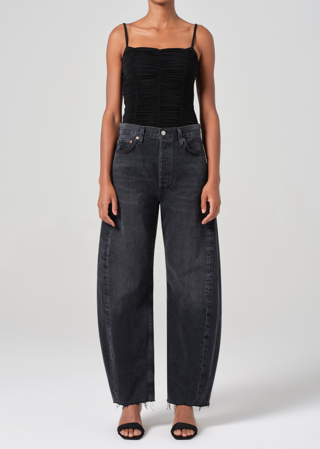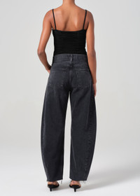 Structured to perfection. The Luna is designed with a waist-accentuating high-rise and a full-length relaxed leg. The pieced insert detailing at the outseam creates a bowed leg silhouette, ideal for taking your everyday denim to the next level. Crafted in our signature Organic Cotton, this style will soften with each wear while keeping its vintage appeal. This fit is true to size. Looks Like: Washed black with a raw hem Feels Like: Midweight, zero stretch cotton with a subtle drape for ease MORE DETAILS Closure: Button Fly Rise: 13" Inseam: 30 1/2" Leg Opening: 17" Model is 5'10" and is wearing a Size 27 Fabric: 100% Organic Cotton Care Instructions: Machine wash cold inside out with like colors. Do not bleach. Tumble dry low. Made in Turkey with imported materials A9039-1157_POSS