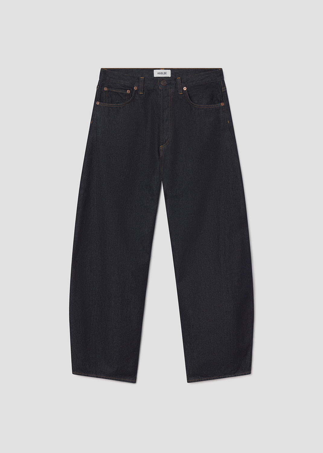 The Luna Pieced Jean is defined by its dramatic, curved leg and high-rise waist, bringing sculptural volume to a classic silhouette. Cut in a dark, clean rinse and crafted from soft, weightless denim, this standout shape is finished with subtle seaming details. Style with a tucked-in top to highlight the unique lines. This fit is true to size. Looks Like: Dark deep rinsed indigo denim pant Feels Like: Non stretch, weightless denim washed down for a super soft feel MORE DETAILS Closure: Button Fly Rise: 12 5/8" Inseam: 30 1/2" Leg Opening: 17" Model is 5'10" and is wearing a Size 27 Fabric: 100% Regenerative Cotton Care Instructions: Machine wash cold inside out with like colors. Do not bleach. Tumble dry low. Made in Turkey with imported materials A9218-1604-NSER