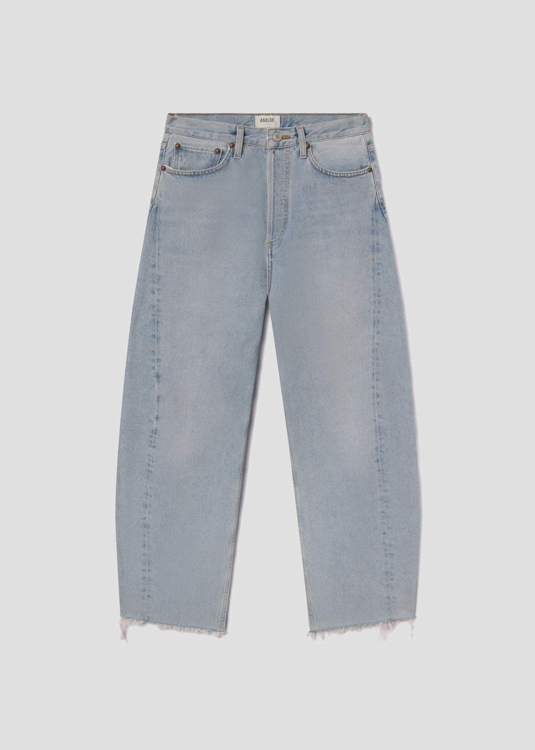 Structured to perfection. The Luna is designed with a waist-accentuating high-rise and a full-length relaxed leg. The pieced insert detailing at the outseam creates a bowed leg silhouette, ideal for taking your everyday denim to the next level. Crafted in our signature Organic Cotton, this style will soften with each wear while keeping its vintage appeal. This fit is true to size. Looks Like: Light vintage indigo with a raw hem Feels Like: Midweight, zero stretch cotton with a subtle drape for ease MORE DETAILS Closure: Button Fly Rise: 13" Inseam: 30 1/2" Leg Opening: 17" Model is 5'10" and is wearing a Size 27 Fabric: 100% Organic Cotton Care Instructions: Machine wash cold inside out with like colors. Do not bleach. Tumble dry low. Made in Turkey with imported materials A9039-1141_VOI