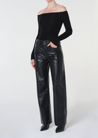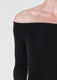 The Maren Bodysuit is a sleek wardrobe staple with a modern off-the-shoulder neckline. Crafted in ultra-soft baby rib, the lightweight long sleeve silhouette is form-fitting and effortless—perfect on its own or as a layering piece. This fit is true to size. Looks Like: True black long sleeve off the shoulder bodysuit Feels Like: Ultra-soft, lightweight fine needle baby rib MORE DETAILS Body Length: 20 1/2" Sleeve Length: 23" Sweep: 25 1/2" Model is 5'10" and wearing a size Small Fabric: 94% Lyocell, 6% Spandex Care Instructions: Machine wash cold inside out with like colors. Do not bleach. Tumble dry low. Made in USA with imported materials A7414-1618-BLK