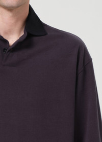 A dark blue collared rugby. Made from 100% Cotton. This fit is true to size. Looks Like: Dark blue collared long sleeve with greyish tones Feels Like: Super soft cotton for all day comfort MORE DETAILS Body Length: 25 1/2" Shoulder to Shoulder: 52 1/4" Sleeve Length: 22 3/4" Model is 5'10" and wearing a size Small Fabric: 100% Cotton Care Instructions: Machine wash cold inside out with like colors. Do not bleach. Tumble dry low. Made in Portugal with imported materials A1043-BANK
