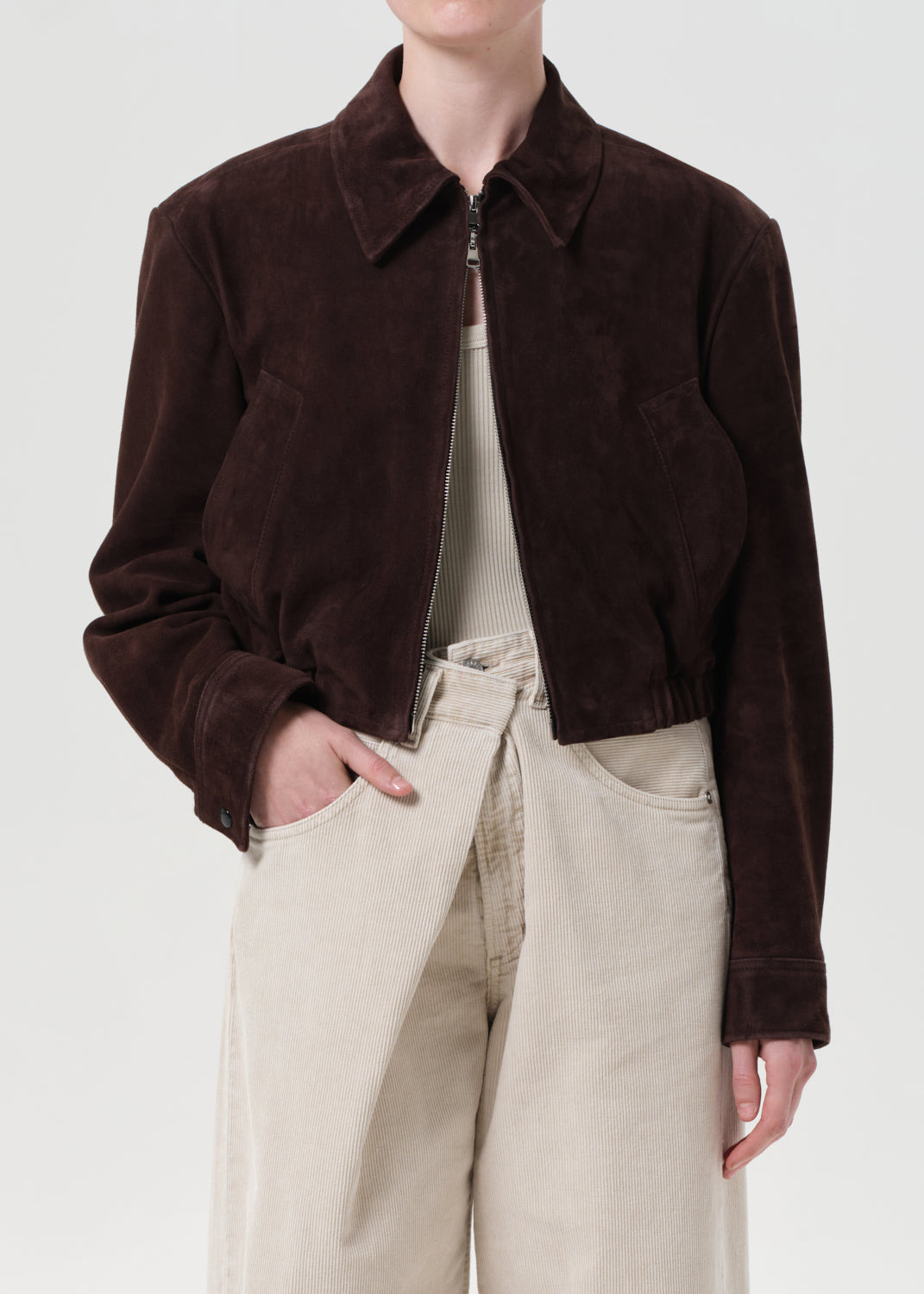 The Nahla Jacket is cut in a rich root brown suede with a cropped silhouette and refined collar detail. This ultra-soft style features a front zip closure and clean seaming for a minimal yet elevated finish. Style it over denim or tailored trousers for a polished layer that still feels relaxed. Looks Like: Dark brown cropped suede jacket Feels Like: Super soft luxe suede MORE DETAILS Model is 5'10" and wearing a size Small Fabric: 100% Suede Care Instructions: Machine wash cold. Made in India with imported materials A5103-ROTO