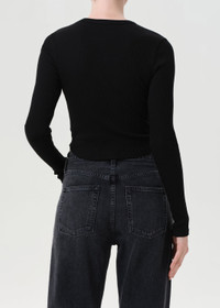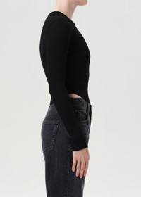 The Neema Tee features a long sleeve design with a curved hem, crafted from ultra-soft, ribbed cotton. Made from a regenerative cotton blend, it offers a supportive fit that’s perfect for layering or wearing on its own. Looks Like: True black long sleeve tee with curved hem Feels Like: Ultra soft and supportive ribbed cotton MORE DETAILS Body Length: 19" Shoulder to Shoulder: 11 1/2" Sleeve Length: 25 1/2" Sweep: 24" Model is 5'10" and wearing a size Small Fabric: 49% Regenerative Cotton, 49% Lyocell, 2% Spandex Care Instructions: Machine wash cold inside out with like colors. Do not bleach. Tumble dry low. Made in USA with imported materials A7383-1260-BLK