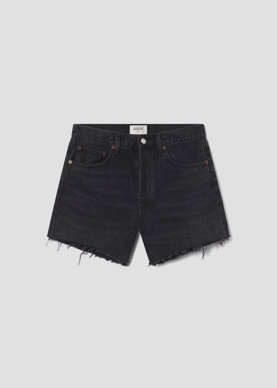 The Parker Long shorts are crafted from non-stretch, regenerative cotton in a saturated black denim wash, complete with subtle whiskering for a lived-in look. With a relaxed high-rise and ample room in the thighs, these shorts offer both comfort and effortless style. Pair them with a simple tee for a laid-back vibe, or elevate with a tailored top for a more refined look. For the shorter inseam, shop our Parker Short. This fit is true to size. Looks Like: Saturated black denim short with whiskering Feels Like: Rigid, non stretch cotton denim with a soft hand for all day wearability MORE DETAILS Closure: Button Fly Rise: 11 1/4" Inseam: 4 1/2" Leg Opening: 24 1/2" Model is 5'10" and is wearing a Size 27 Fabric: 100% Organic Cotton Care Instructions: Machine wash cold inside out with like colors. Do not bleach. Tumble dry low. Made in Turkey with imported materials A9010C-1157-FRGHT