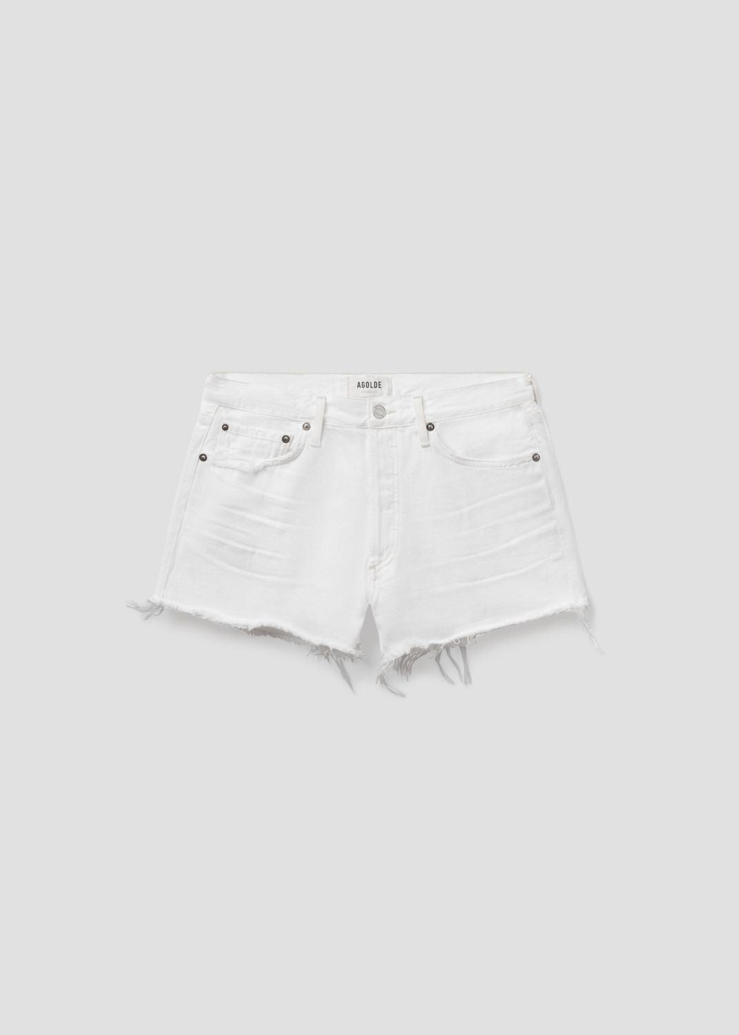 The Parker Short in clean white denim offers a high-rise fit with a relaxed silhouette through the hips. Made from regenerative cotton, these non-stretch shorts deliver a crisp, fresh look that's both stylish and versatile. Perfect for pairing with casual tees or lightweight blouses for an effortless, laid-back vibe. For a longer inseam, shop the Parker Long. This fit is true to size. Looks Like: Clean vintage white denim short Feels Like: Rigid, non stretch denim made with an authentic, soft hand feel MORE DETAILS Closure: Button Fly Rise: 11 1/4" Inseam: 2 1/2" Leg Opening: 24 1/2" Model is 5'10" and is wearing a Size 27 Fabric: 100% Regenerative Cotton Care Instructions: Machine wash cold inside out with like colors. Do not bleach. Tumble dry low. Made in Turkey with imported materials A026E-1183-RPS