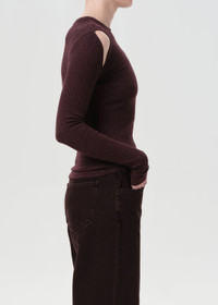 The Pierce Tee is a long sleeve, body-hugging silhouette with shoulder cutouts for a subtle edge. Wear it tucked into high-rise denim or layered under a jacket. This fit is true to size. Looks Like: Dark brown and burgundy long sleeve tee with cut outs at the shoulder Feels Like: Midweight intermingle chunky rib that hugs the body MORE DETAILS Body Length: 24 3/4" Shoulder to Shoulder: 13 1/2" Sleeve Length: 26 1/8" Model is 5'10" and wearing a size Small Fabric: 50% Polyester, 32% Cotton, 18% Rayon Care Instructions: Machine wash cold. Made in USA with imported materials A7386-1352-RIS
