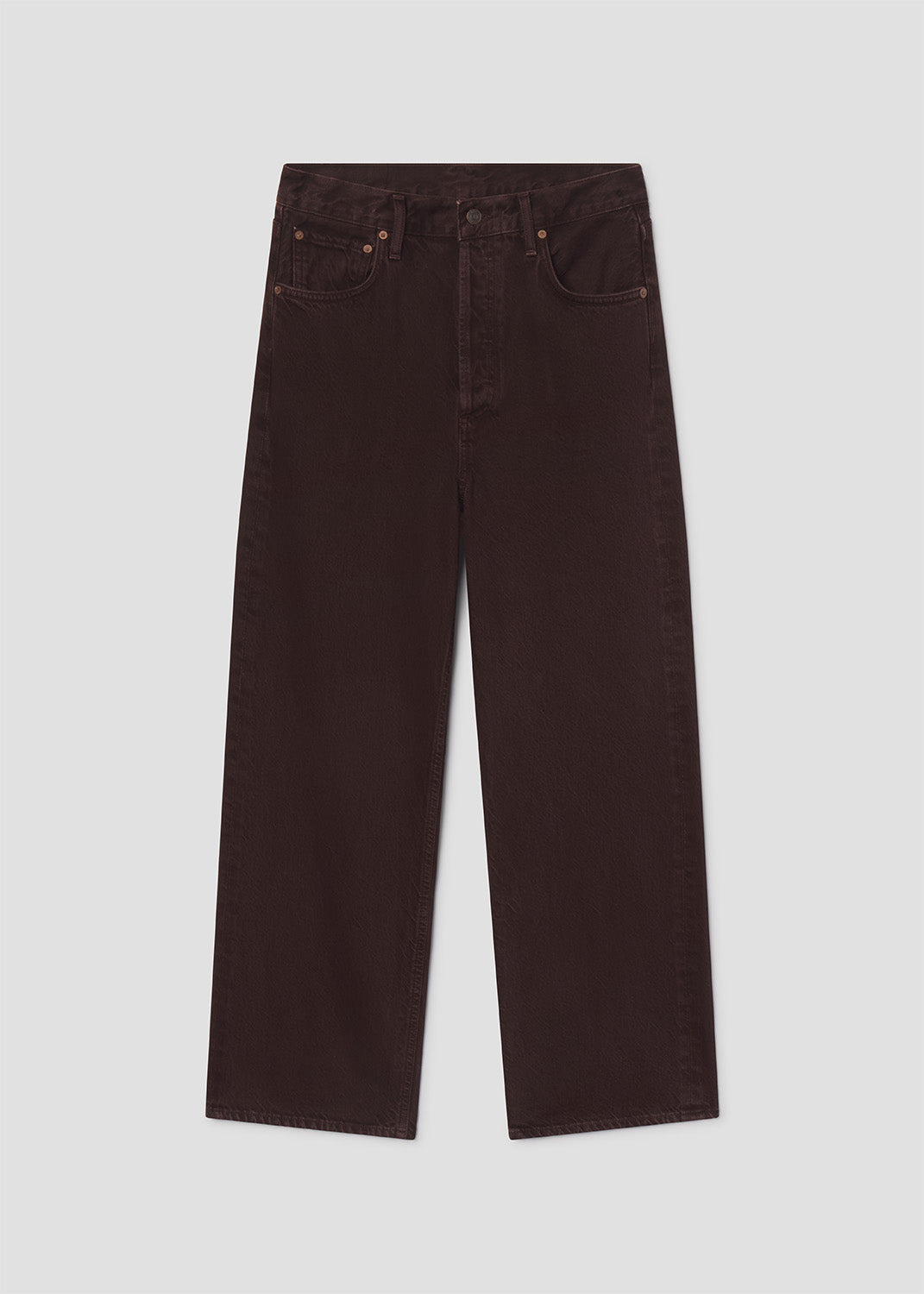 AGOLDE’s Ren Jean offers an elevated take on the classic wide-leg silhouette. Made from 100% rigid, non-stretch regenerative cotton, these high-rise jeans feature a deep grape tone with brown undertones and subtle marbling. The cropped wide legs create a relaxed yet flattering fit, while the heavyweight denim ensures all-day comfort. Pair with neutral tones or a crisp white top for a polished look. This fit is true to size. For a shorter inseam, shop the Ren Jean Petite 25" Looks Like: Dark grape colored denim pant with brown undertones Feels Like: Rigid, non stretch cotton denim with a soft hand for all day wearability MORE DETAILS Closure: Button Fly Rise: 12 1/4" Inseam: 27 1/2" Leg Opening: 19 1/2" Model is 5'10" and is wearing a Size 27 Fabric: 100% Regenerative Cotton Care Instructions: Machine wash cold inside out with like colors. Do not bleach. Tumble dry low. Made in Turkey with imported materials A9191E-1183-SLBR