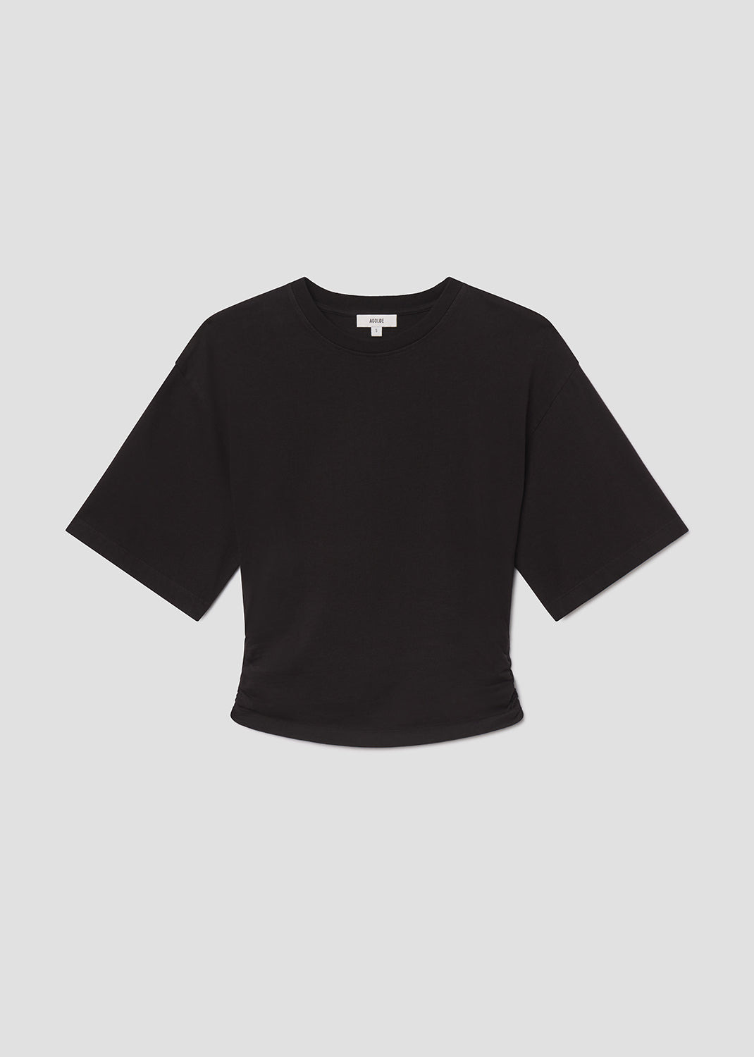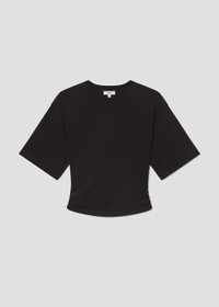 A fresh take on the classic tee. The Shari is cut from lightweight cotton jersey with exaggerated short sleeves and a slightly cropped fit. This fit is true to size. Looks Like: True black exaggerated short sleeve tee Feels Like: Lightweight jersey cotton MORE DETAILS Body Length: 19" Chest: 38" Sweep: 28 1/2" Shoulder to Shoulder: 20 3/8" Sleeve Length: 9 7/8" Model is 5'10" and wearing a size Small Fabric: 100% Cotton Care Instructions: Machine wash cold. Made in USA with imported materials A7392-1521-BLK
