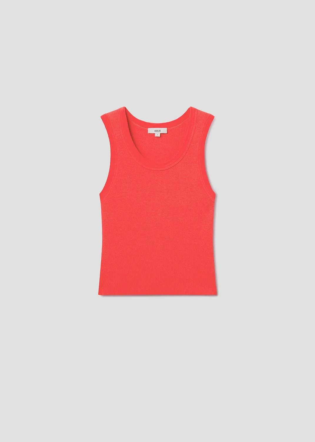 The Shrunken Poppy is a wardrobe essential with a modern update. Crafted from our signature rib, it combines support and breathability for all-day comfort. Designed with a flattering U-shape neckline and a close-to-the-body fit, this cropped version is ideal for layering or wearing on its own. Its versatile style effortlessly pairs with high-waisted jeans or skirts, making it a perfect go-to for elevated, everyday looks. This fit is true to size. Looks Like: Medium bright red shurnken ribbed tank with coral undertones Feels Like: Ultra soft and supportive ribbed cotton MORE DETAILS Body Length: 19" Chest: 23" Sweep: 22 1/2" Shoulder to Shoulder: 11 3/4" Model is 5'10" and wearing a size Small Fabric: 49% Organic Cotton, 49% Lyocell, 2% Spandex Care Instructions: Machine wash cold. Made in USA with imported materials A7367-1260-CVAL