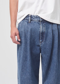 Relaxed straight leg with easy, pleated detailing and a subtle taper. This fit is true to size. Looks Like: Medium indigo with pleating detail Feels Like: Non-stretch regenerative cotton with an easy drape MORE DETAILS Closure: Zipper Fly Rise: 14 1/2" Inseam: 30 1/2" Leg Opening: 19 1/2" Model is 6'2" and is wearing a Size 32 Fabric: 100% Regenerative Cotton Care Instructions: Machine wash cold inside out with like colors. Do not bleach. Tumble dry low. Made in Turkey with imported materials A666-1206-IMGN
