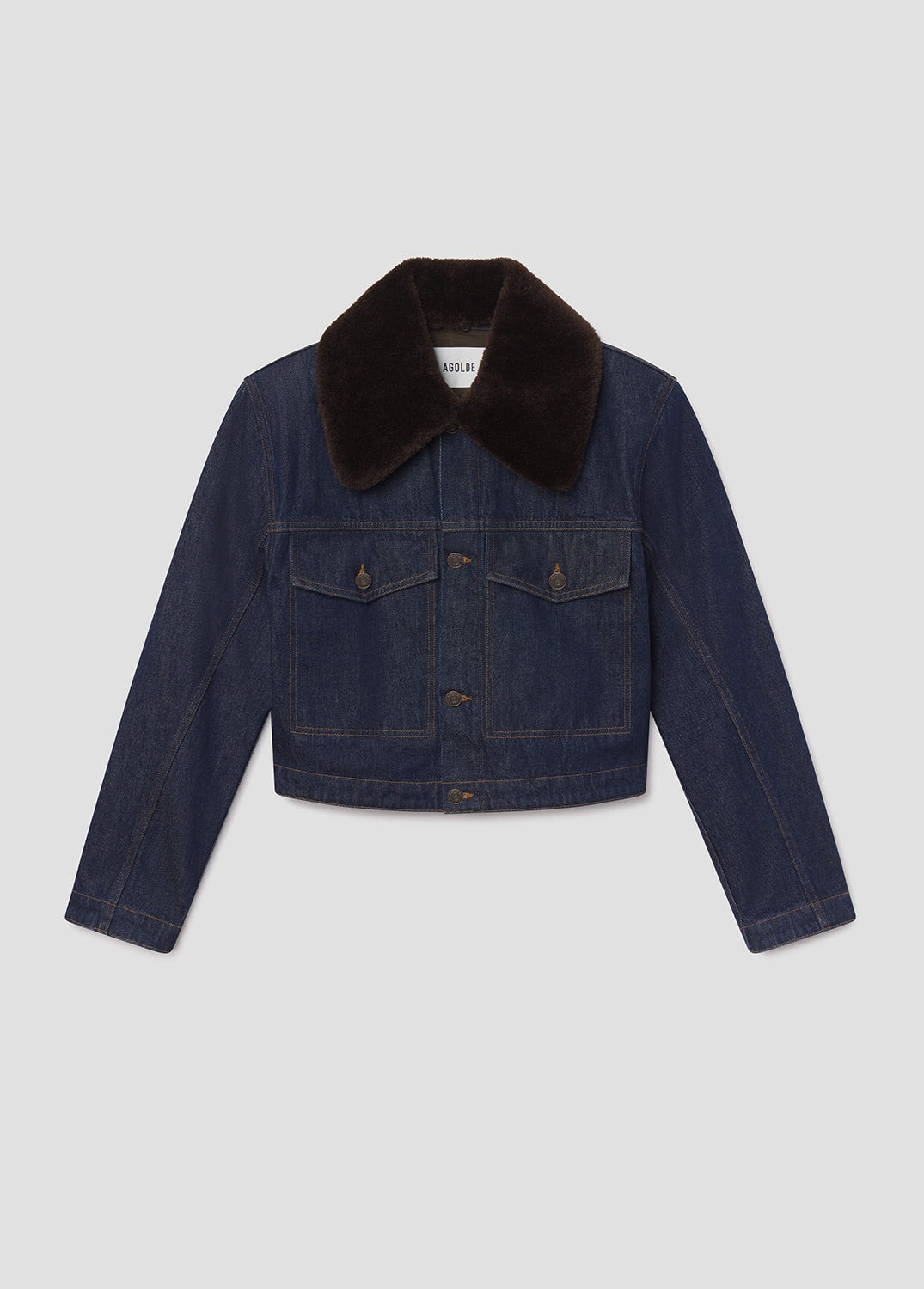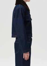 A refined update to a timeless staple, the Walker Jacket features a cropped silhouette in a clean dark rinse with a removable faux fur collar for seasonal versatility. Style it with tonal denim for a polished, everyday uniform. This fit is true to size. Looks Like: Clean dark rinse cropped denim jacket with faux fur collar Feels Like: Rigid, non stretch cotton denim with a soft hand for all day wearability MORE DETAILS Body Length: 21" Shoulder to Shoulder: 19" Sleeve Length: 24" Model is 5'10" and wearing a size Small Fabric: 100% Regenerative Cotton Care Instructions: Machine wash cold. Made in Turkey with imported materials A5109-1810-NSE