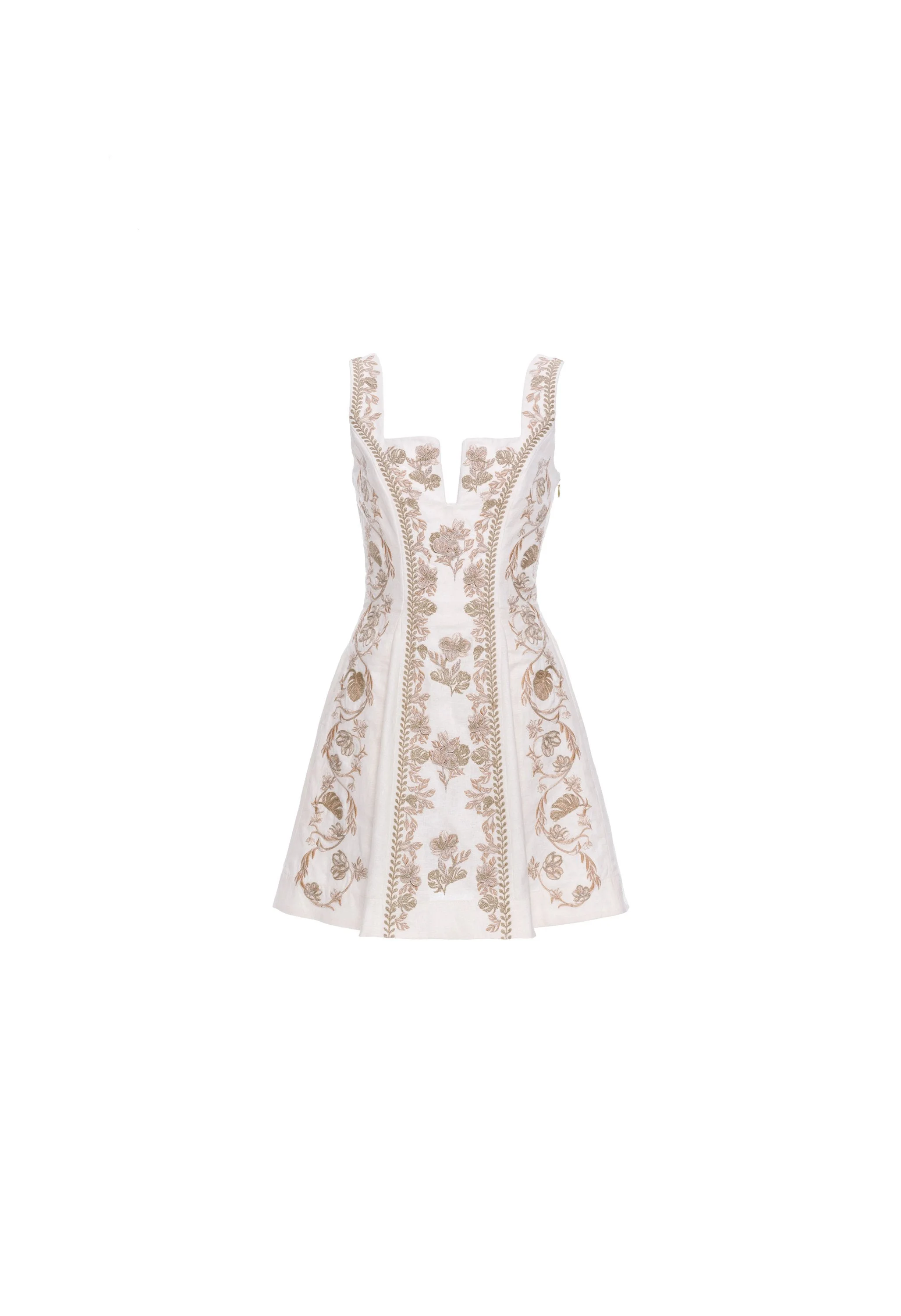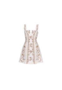 The new embroidered ´Agua Madera´ captures the essence of femininity with its timeless silhouette and delicate floral print. Featuring a structured bodice with a subtle sweetheart neckline and wide straps for added elegance, this dress cinches at the waist and flows into a flattering, full skirt. - Embroidered - Novelty - Structured bodice - Sweetheart neckline - Mini length COMPOSITION 100% Linen SIZE & FIT Jessica is 177 cm / 5´8 and is wearing a size extra small