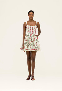 The ’Granadilla Quebrada’ mini dress has a square neckline, delicate shoulder straps, and a gathered skirt for a flattering fit. Made from linen, it closes with a hidden zip at the back. Unlined for a light, comfortable feel. - Linen - Mini Dress - Handmade embroidery on the straps - Sleeveless - Placement Print COMPOSITION 100% Linen Lining: 100% Linen SIZE & FIT Isabella is 179 cm / 5’10’’ and is wearing a size extra small