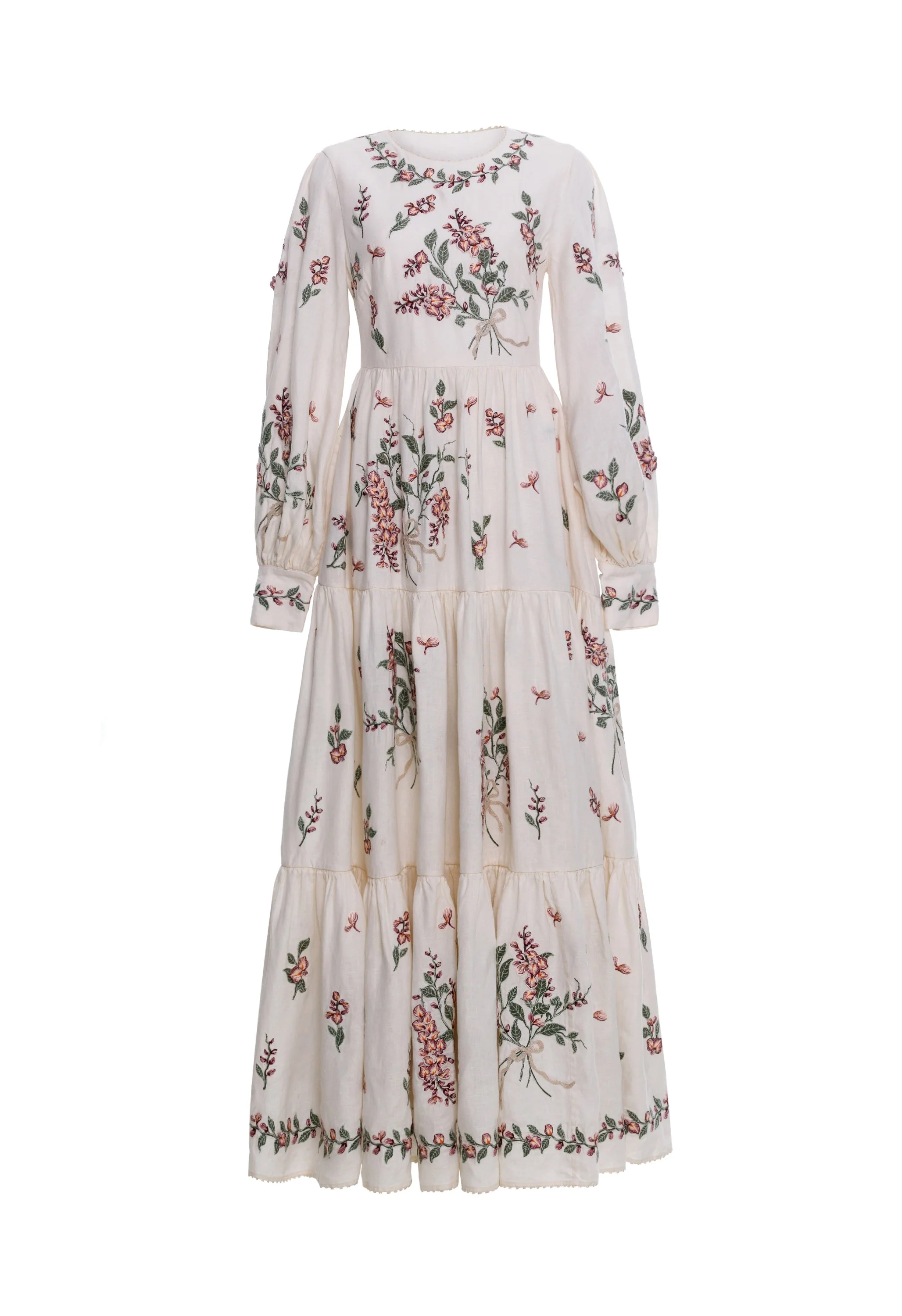 Our ´Nuez Wisteria´ maxi dress in linen is a chic and timeless piece meant to be worn season after season. This garment features concealed zip fastening along the back. - Fully embroidered - Carry over - Maxi length - Long sleeves - Concealed zip fastening along back COMPOSITION 100% Linen SIZE & FIT Isabella is 179 cm / 5´9 and is wearing a size extra small