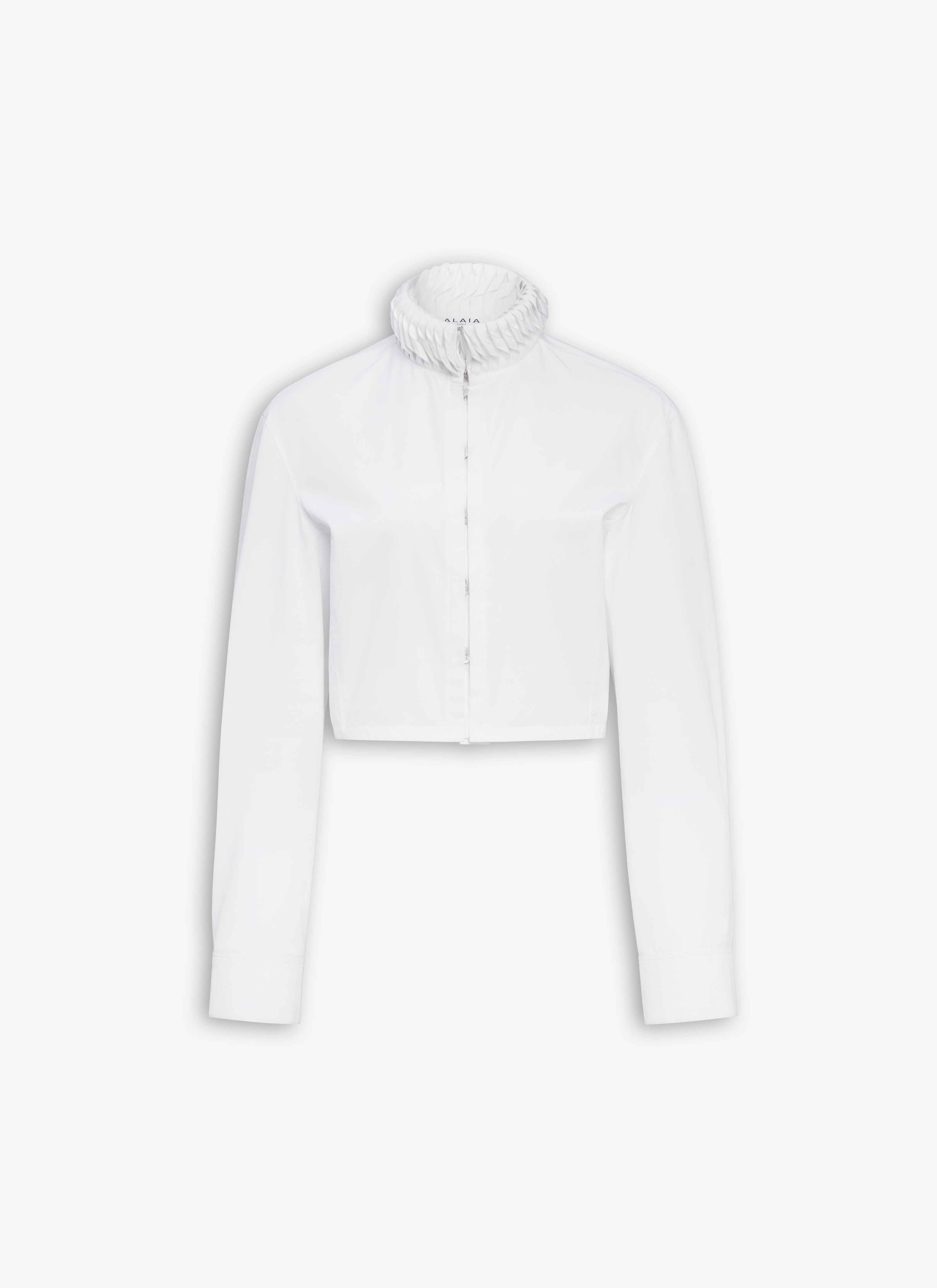 High neck cropped blouse in cotton poplin Long sleeves, shirt collar trimmed with twisted details, hidden button closure Fitted cut Made in Italy DETAILS MAIN MATERIAL : 100% COTTON PRODUCT REFERENCE : AA9C0996T611B-000