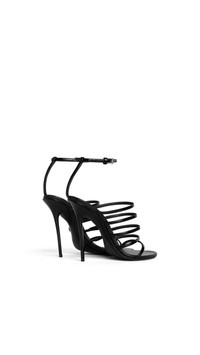 DETAILS Strappy sandals with lacquered stiletto heel Drop shaped heel base 110 mm heel Adjustable ankle strap Slightly crinkled shiny calfskin leather Made in Italy MATERIALS Highlights MAIN MATERIAL: 100% CALFSKIN LEATHER MAIN LINING: 95% LAMBSKIN LEATHER, 5% GOATSKIN LEATHER SOLE: 70% RUBBER, 30% CALFSKIN LEATHER HEEL: 100% ACRYLONITR BUTADIENE STYR BUCKLE: 100% ZAMAK PRODUCT REFERENCE: AA3S2015I135-999