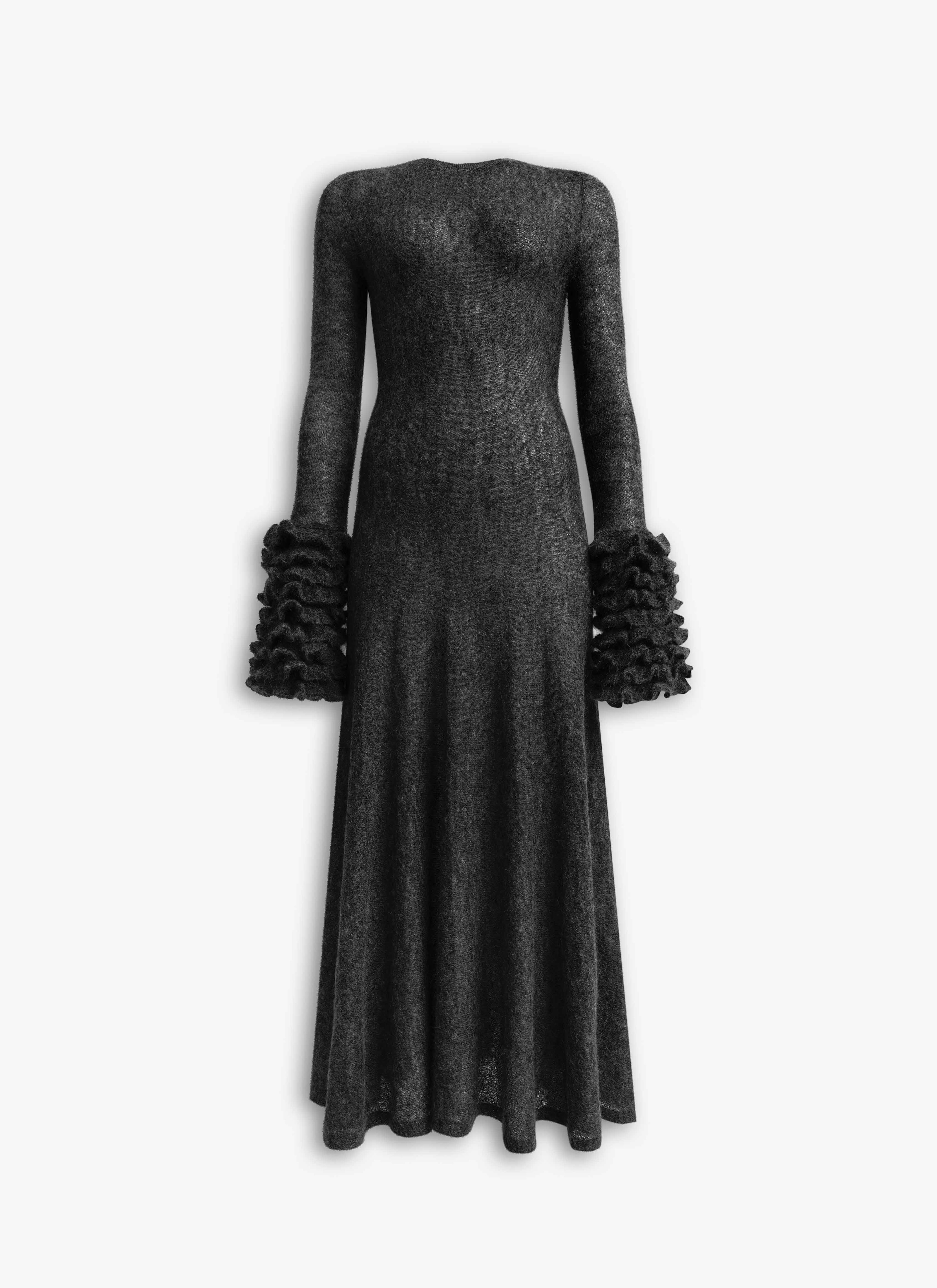 Frills dress in mohair knit Mid-length, long sleeves, high neck, ruffle cuffs details Sculptural frills Flare silhouette Made in Italy DETAILS MAIN MATERIAL : 58% MOHAIR WOOL 32% POLYAMIDE 10% WOOL PRODUCT REFERENCE : AA9R2788K101B-995