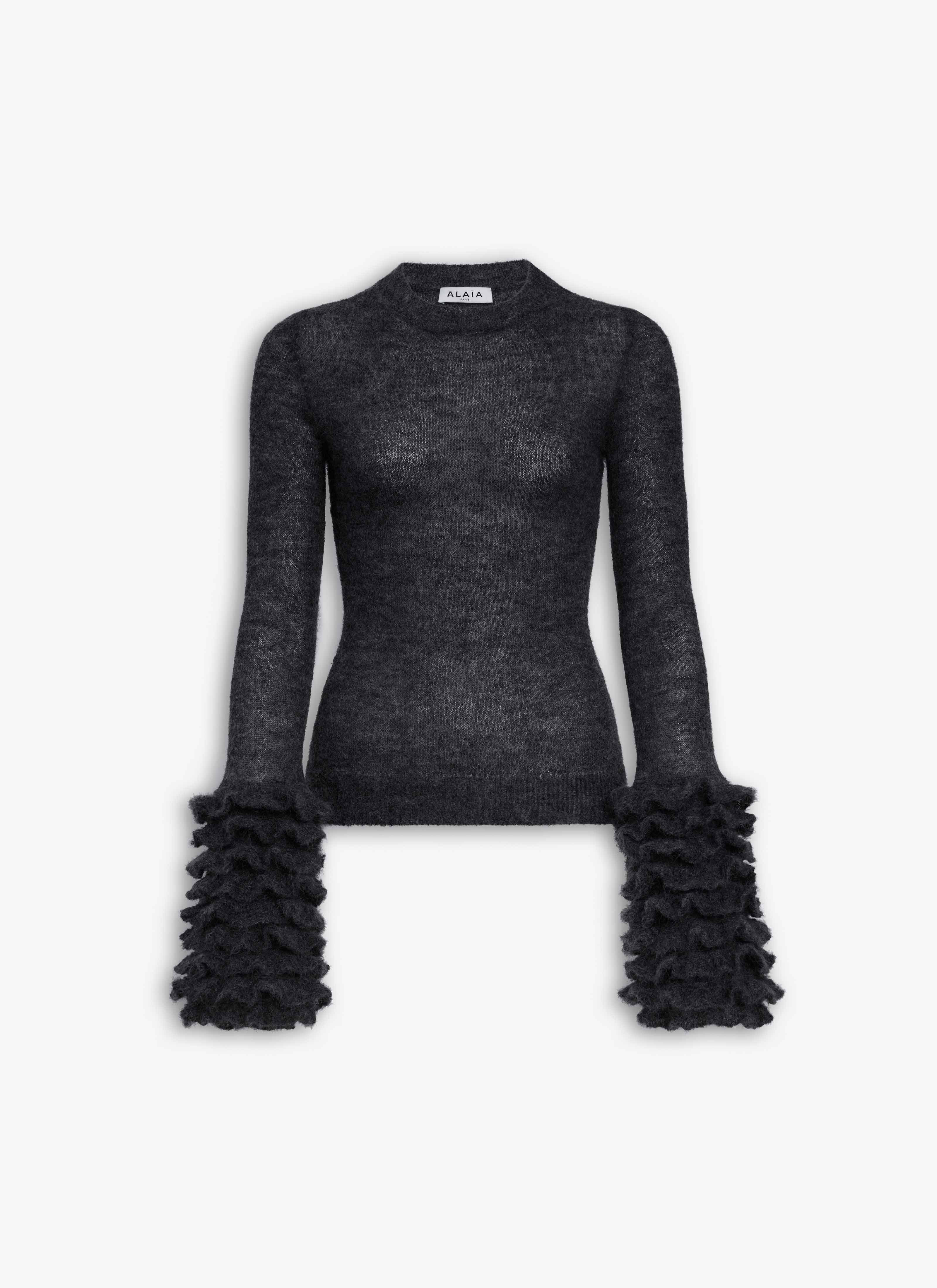 Frills jumper in mohair knit Long sleeves, crew neck, ruffled cuff details Made in Italy DETAILS MAIN MATERIAL : 56% MOHAIR WOOL 34% POLYAMIDE 10% WOOL PRODUCT REFERENCE : AA9G0076K101B-995