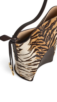 DETAILS Small bucket bag Anatomical curved shape of the molded base Adjustable strap Ring metal charms with ALAIA tag Tiger printed haircalf leather Dimensions (cm): L 20 X H 29 X D 11 Made in Italy MATERIALS Highlights MAIN MATERIAL: 100% CALFSKIN LEATHER PRODUCT REFERENCE: AA1L6005I105-113