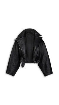 DETAILS Biker jacket in washed leather Front zipper reveals an inner underlayer Wide collar and drop sleeves, asymmetrical zip closure, buckle belt all in silver hardware, welt pockets Relaxed fit Made in Italy MATERIALS MAIN MATERIAL: 100% CALF LEATHER SECONDARY MATERIAL: 100% COTTON MAIN LINING: 100% POLYAMIDE POCKET LINING: 100% COTTON PRODUCT REFERENCE: AA9V1276X109C-995