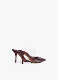 Mules with the signature heart cut at the front of the shoe 90 mm heel, pointy toes Patent leather with transparent polyuretane Made in Italy DETAILS MAIN LINING: 100% LAMBSKIN SOLE: 80% CALF LEATHER 20% RUBBER UPPER MATERIAL 1: 100% POLYURETHANE UPPER MATERIAL 2: 100% CALF LEATHER PRODUCT REFERENCE: AA3M053CK150 - 325