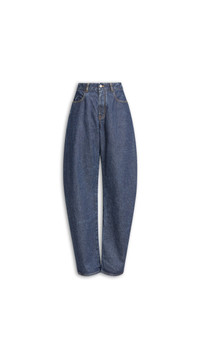 DETAILS Round jeans in dark blue denim Barrel leg, low waist with zip fly and button, silver hardware Classic back and front pockets One signature Alaia dart in the back Made in Italy MATERIALS Highlights MAIN MATERIAL: 99% COTTON, 1% POLYURETHANE LINING: 65% POLYESTER, 35% COTTON PRODUCT REFERENCE: AA9P1215D014C-A24