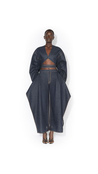 DETAILS Wide jeans in raw denim Mid-waist, wide leg, zip and button in silver hardware, topstiching, five pockets Ruffle detail along the sides Made in Italy MATERIALS MAIN MATERIAL: 99% COTTON, 1% POLYURETHANE POCKET LINING: 65% POLYESTER, 35% COTTON PRODUCT REFERENCE: AA9P1341D008C-A08