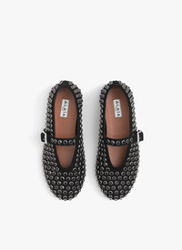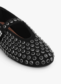 Signature Alaia ballet flats inspired by classical Japonese shoes Buckle strap on top, round toes, rubber sole Suede goatskin leather adorned with riveted strass Made in Italy DETAILS MAIN LINING: 100% LAMBSKIN MAIN APPLICATION: 100% ACRYLIC SOLE: 100% RUBBER UPPER MATERIAL 1: 100% GOAT LEATHER BUCKLE: 100% ZAMAK PRODUCT REFERENCE: AA3A029CK234 - 999