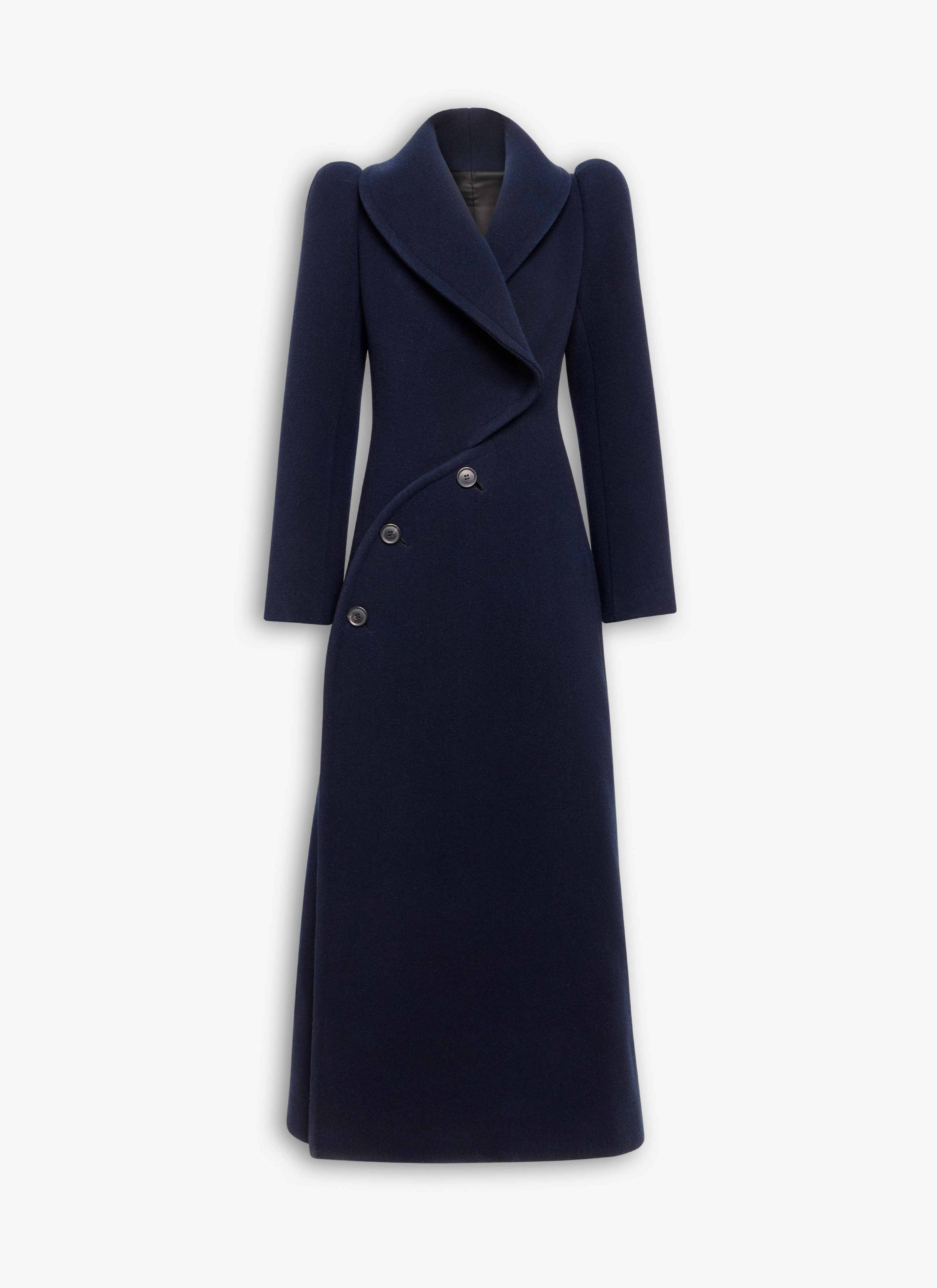 Curved coat in merino double face wool Full length, shawl collar, buttons closure, side pockets Fitted cut Made in Italy DETAILS MAIN MATERIAL : 100% VIRGIN WOOL PRODUCT REFERENCE : AA9M1098T473B-537