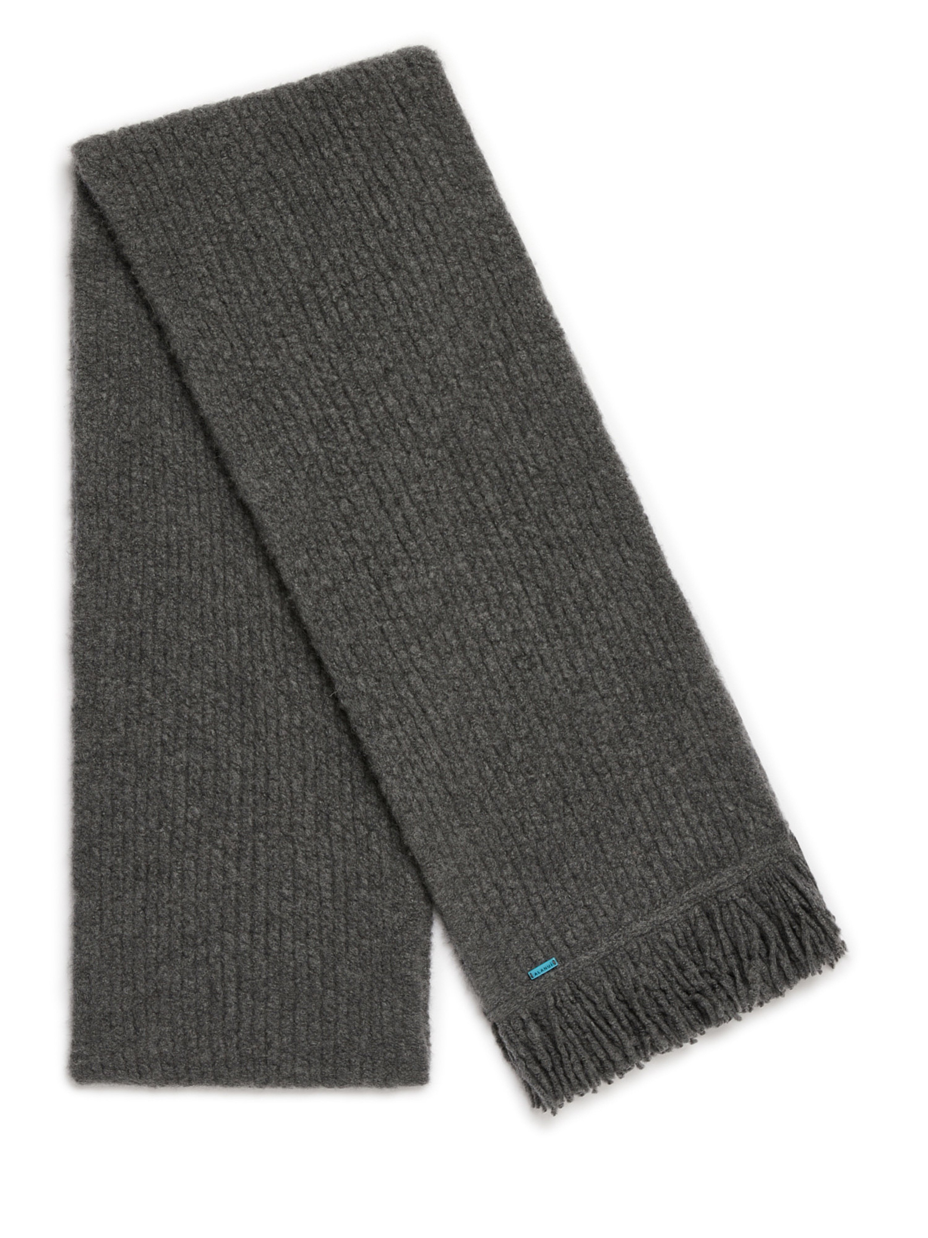 Part of our new luxury wellbeing line, the Alanui Finest Scarf boasts the super soft luxurious touch of a cashmere and silk blend crafted with English rib stitch. Each piece in the Alanui Finest line has been specially designed for your comfort and relaxation. Featuring fringed finishes and Alanui logo stitched onto the end. DETAILS - Product Code LMMA005E25KNI0010600 - Crafted from 90% Cashmere and 10% Silk. - The model is 189 cm and wears a size M. - This item fits true to size.