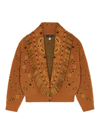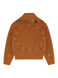 Reimagining the signature cardigan, the Bandana Jacquard Cardi-Bomber pairs the iconic Bandana Pattern with a contemporary cropped fit. Finely crafted from cashmere and virgin wool using double jacquard knit, each Cardi-Bomber features a multicolored fringed collar, ribbed finishes and real horn buttons. PRODUCT DETAILS Product Code LWHB026E24KNI0012318 Made In Italy Crafted from 70% Virgin Wool and 30% Cashmere. This item weighs 0.810 kg and takes three hours to be knitted and another five and an half to be assembled. The model is 178 cm and wears a size M. This item fits true to size.