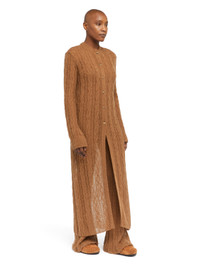 This Fall / Winter 2025, Alanui sets off on a journey around the world, heading east into the wilds of California. Inspired by the spirit of desert wanderers, the Desert Drift Cardigan features a new long style in a barely-there baby alpaca, cashmere, and silk blend. A braided motif in all-over cable stitch and distressed detailing evoke a lived-in feel. Finished with real horn buttons. DETAILS - Product Code LWHB085E25KNI0016200 - Crafted from 40% Alpaca 30% Cashmere 30% Silk. - The model is 177 CM and wears a size M. - This item fits true to size.