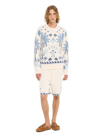 This Spring / Summer 2026, Alanui dives into the mystical allure of French Polynesia. Crafted in Italy using double jacquard knit, the Echoes of the Island Sweater is made from a premium cotton and wool blend and features a textured, island-inspired foulard motif in a cozy sweater fit. Complete with ribbed finishes. Pair with matching Bermuda shorts. DETAILS - Product Code LMHE033R26KNI002OF45 - Crafted from 60% Wool 40% Cotton Product weight: 854 grTaking three and a half hours to be knitted and another three to be assembled. - The model is 189 cm and wears a size M. - The item fits true to size.