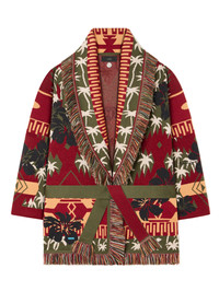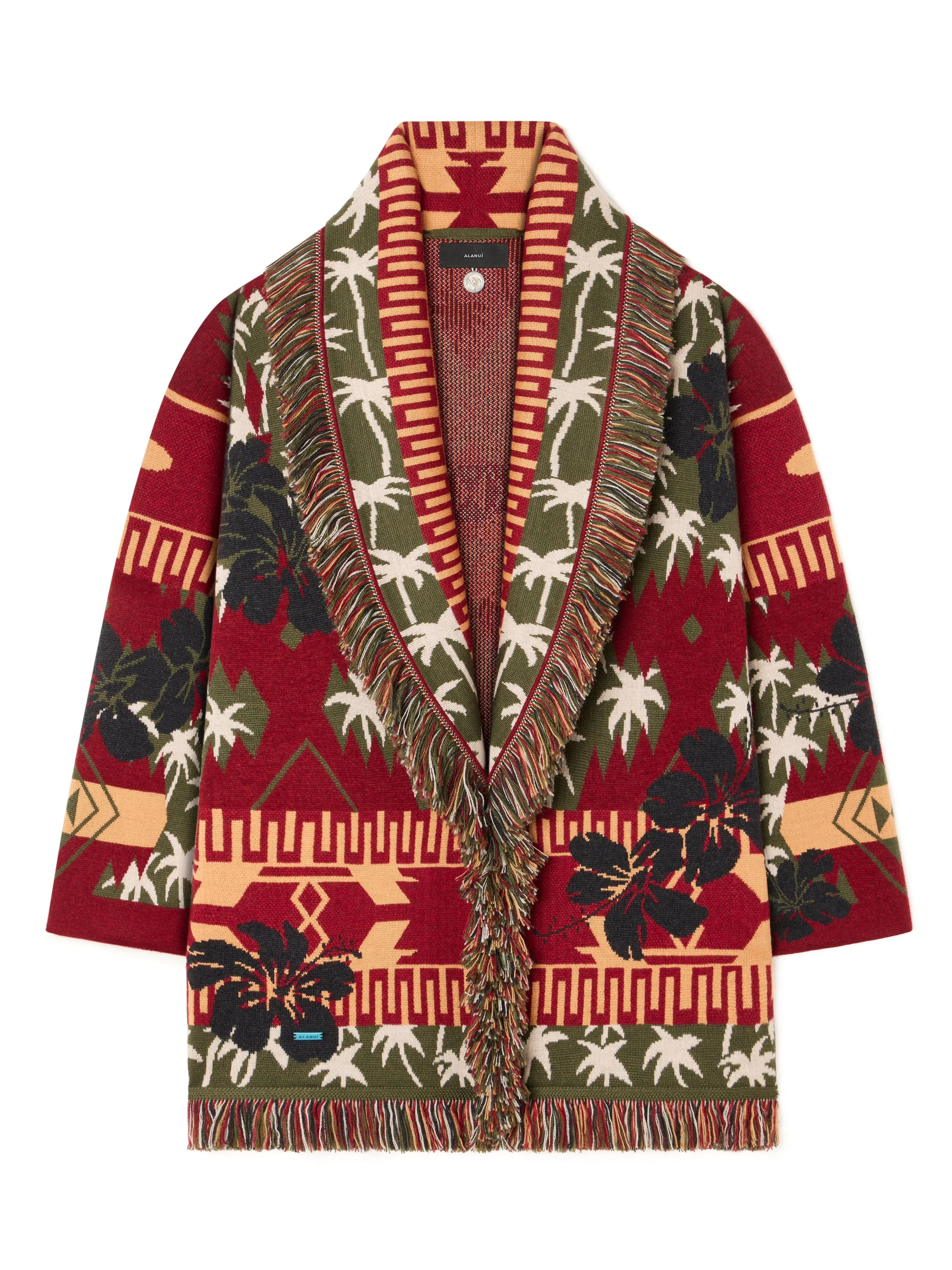 Alanui’s Fall / Winter 2025 trip around the world kicks off in Hawaii where the Hibiscus Bloom Cardigan celebrates the island’s iconic native flower. Crafted in Italy from the softest virgin wool, this style pairs the Icon fit and Alanui Iconic Pattern with an all-over palm motif and Hibiscus blooms in double jacquard knit. Finished with a two-tone tie belt and multicolored fringed edges. DETAILS - Product Code LWHB064E25KNI0095625 - Crafted from 100% Virgin Wool. - The model is 180 CM and wears a size M. - This item fits true to size.