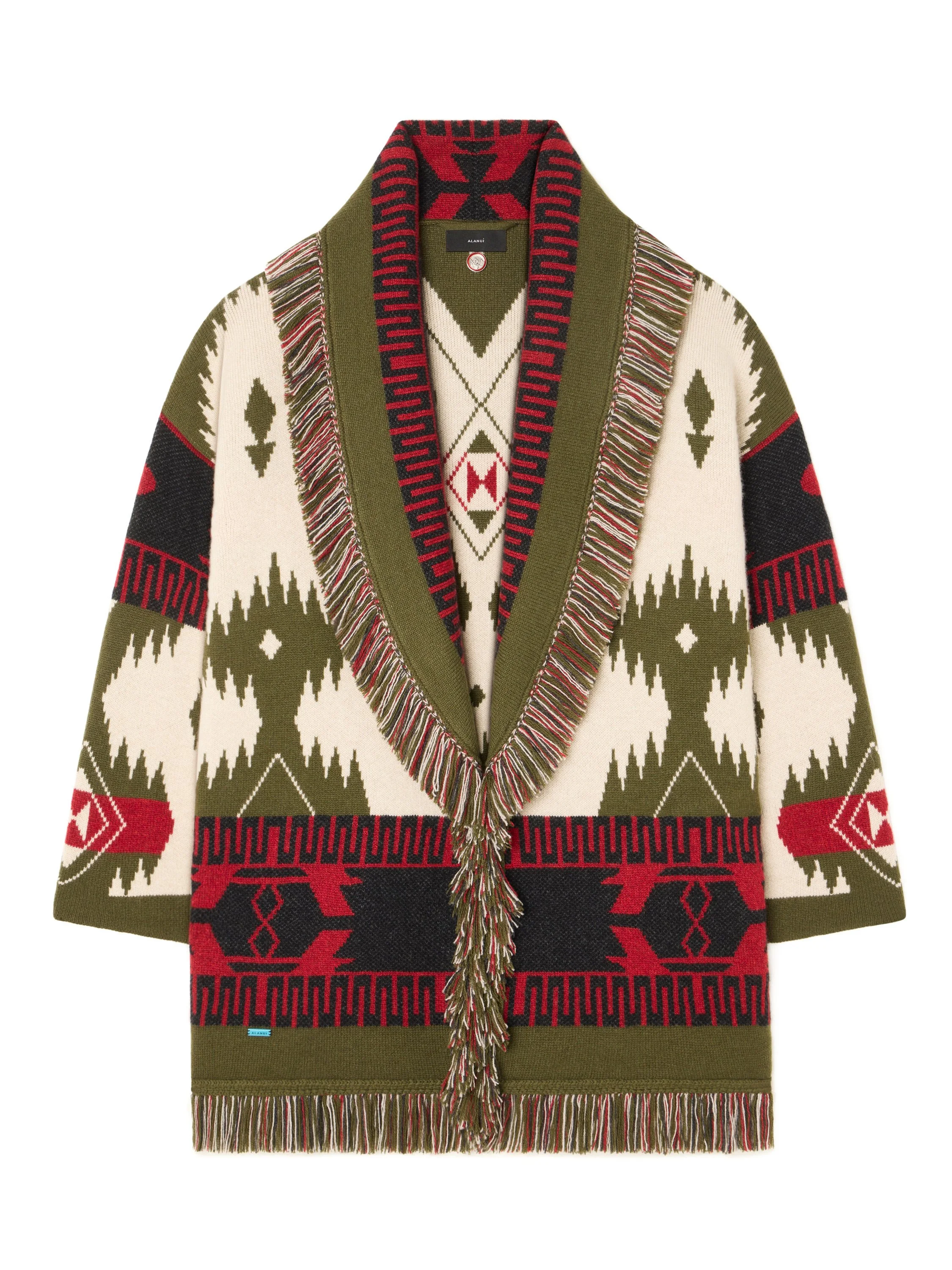 Crafted for comfort, travel, and style, this timeless cardigan remains the heart of the Alanui wardrobe season after season. Pairing the original Icon fit with the iconic Alanui Pattern to create a classic luxury style, each cardigan is lovingly crafted from pure cashmere using intricate double jacquard knit. Finished with a signature two-tone tie belt and multicolored fringed edges. DETAILS - Product Code LWHB064E25KNI0020F56 - Crafted from 100% Cashmere. - The model is 176 CM and wears a size M. - This item fits true to size.
