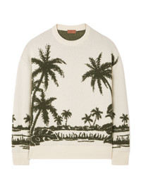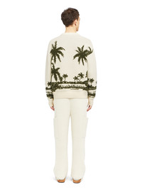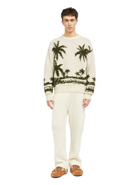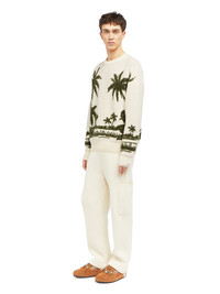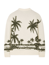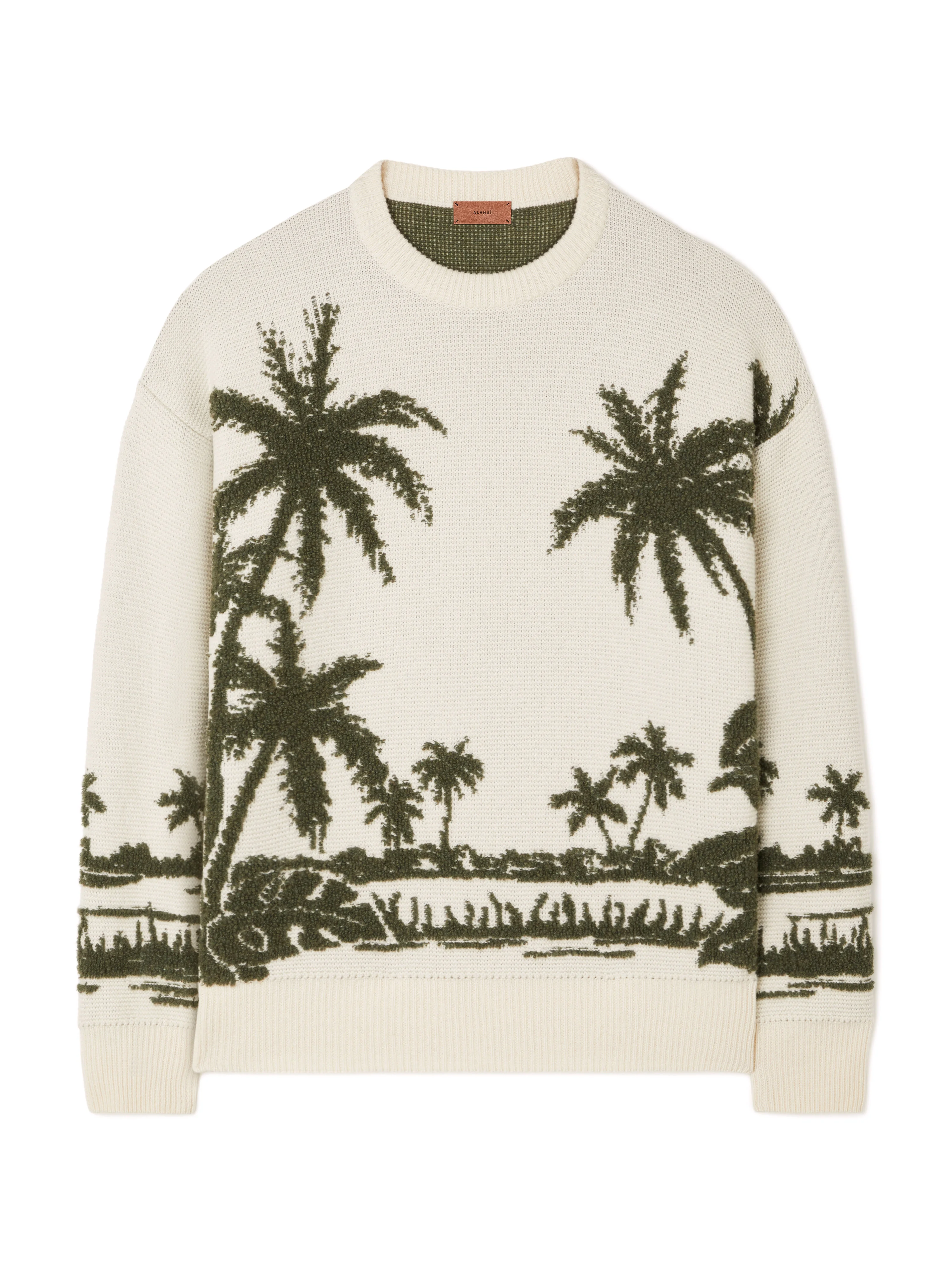 Kicking off in the Pacific Ocean, Alanui’s Fall / Winter 2025 trip celebrates the power of nature. Crafted in Italy from a recycled cashmere and wool blend using 3D double jacquard knit, the Palm Grove Tales Sweater pairs a postcard-perfect Hawaiian scene with a crewneck fit. Finished with ribbed trims. DETAILS - Product Code LMHE033E25KNI0020F56 - Crafted from 91% Cashmere 5% Wool 4% Polyammide. - The model is 189 CM and wears a size M. - This item fits true to size.